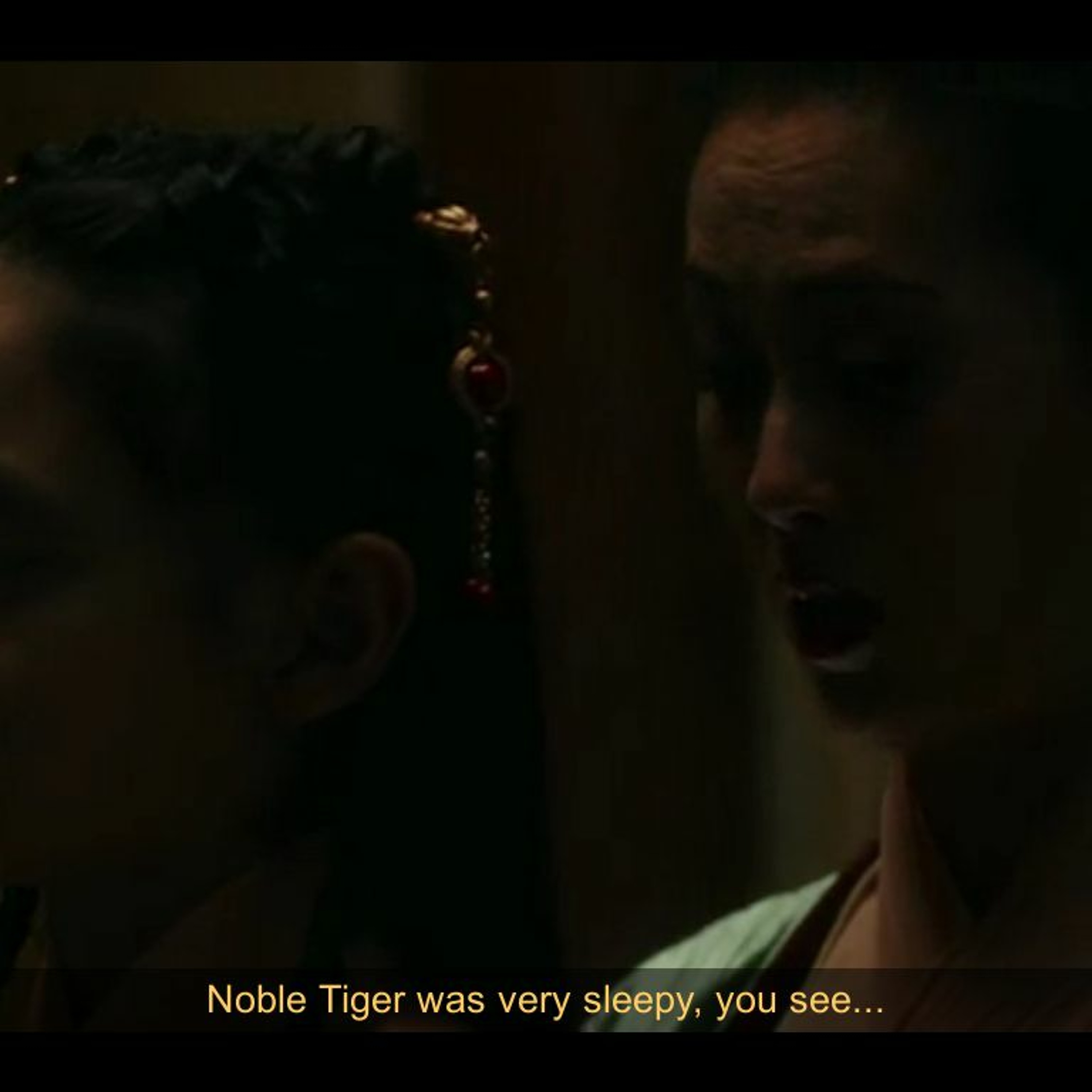 [Mei Lin] Noble Tiger traveled a great distance… and began to find his eyes growing heavy. Noble Tiger was very sleepy, you see… for he was very old. Did he have no more teeth? He still had teeth... just no longer sharp.