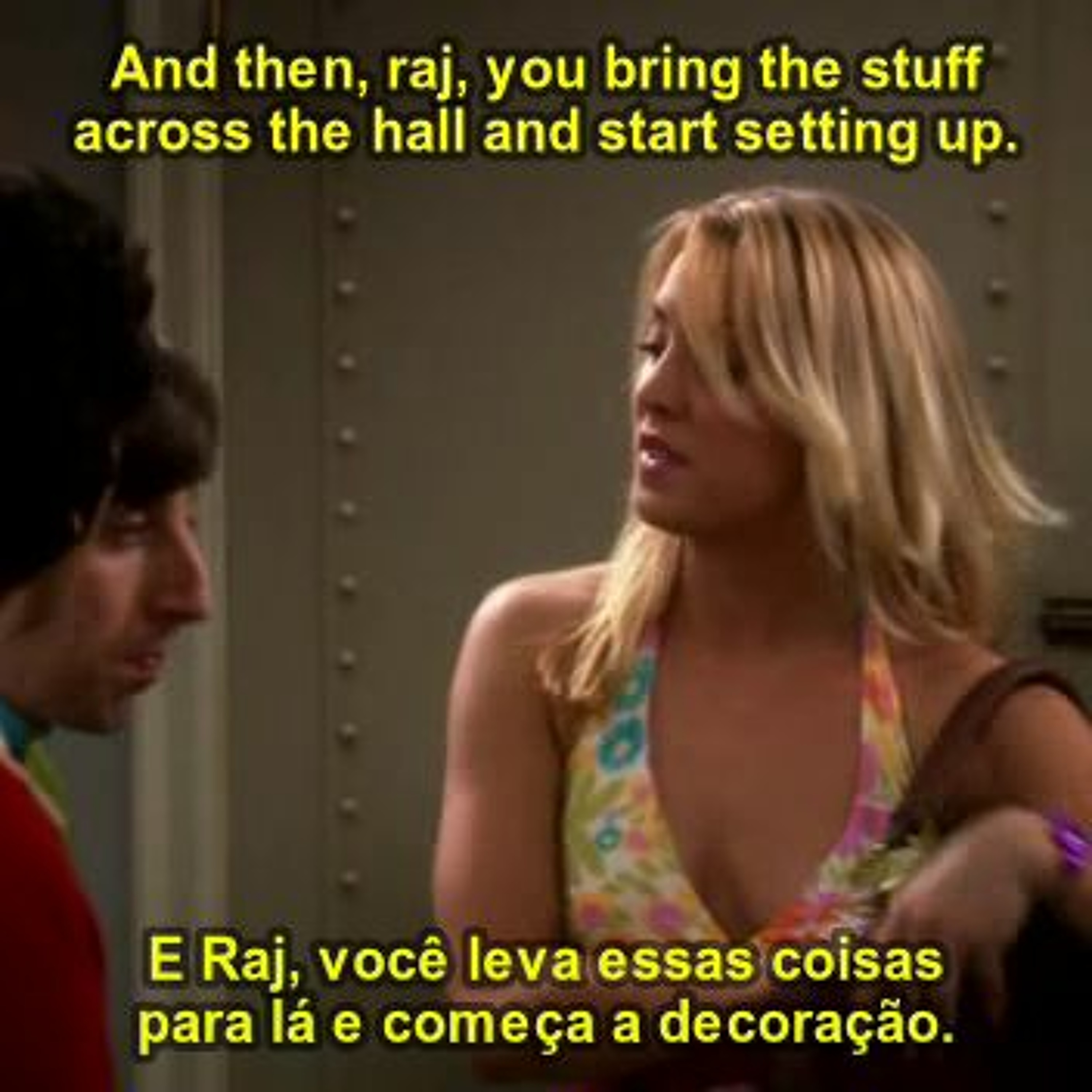 Raj, você leva essas coisas para lá (pelo salão) e começa a decoração/preparos. - E se chegarem convidados? - Divirta-os. E se forem mulheres? Fique olhando para elas e as faça se sentirem desconfortáveis.