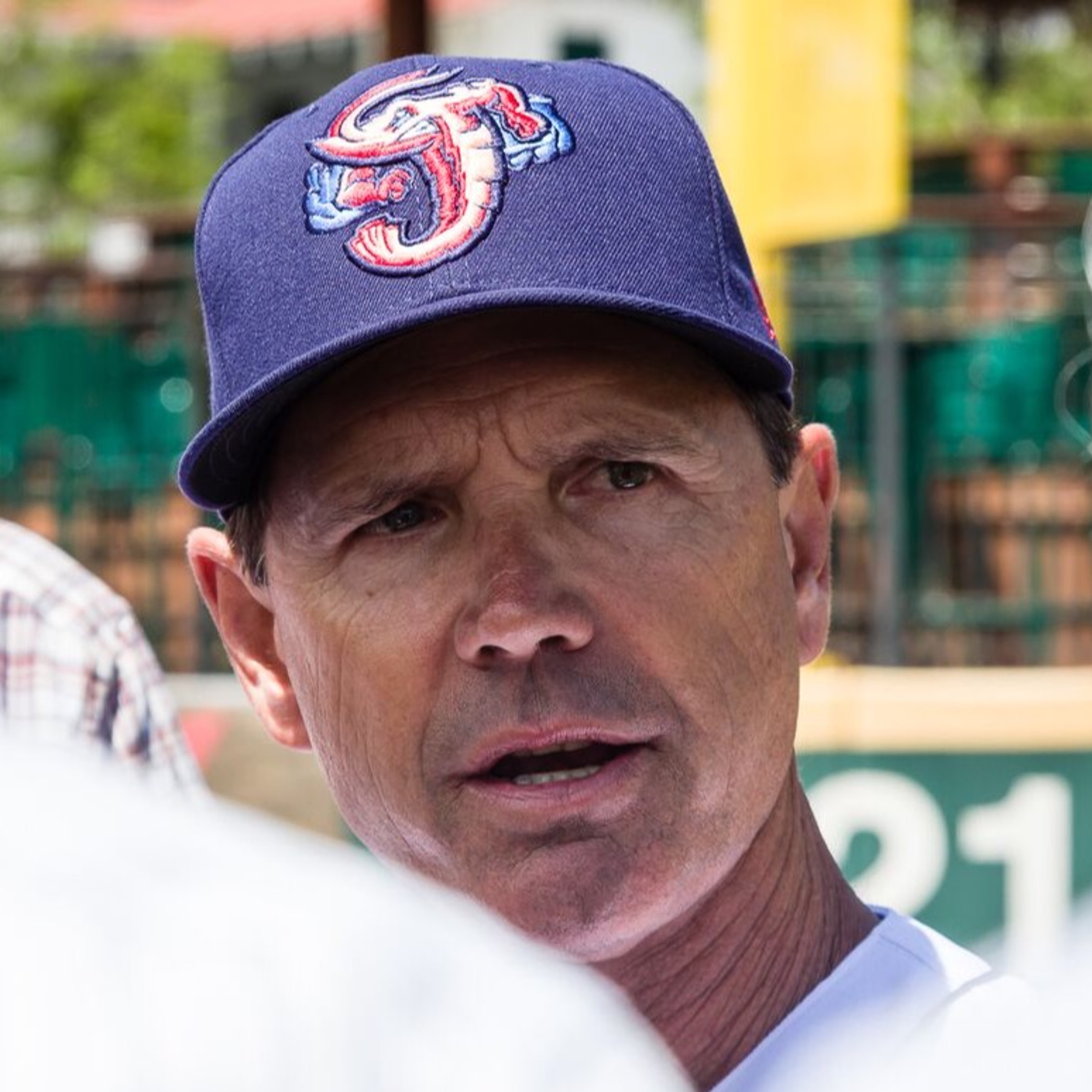 Roger Hoover interviews Jacksonville Jumbo Shrimp manager Randy Ready in Jacksonville on August 21, 2017.