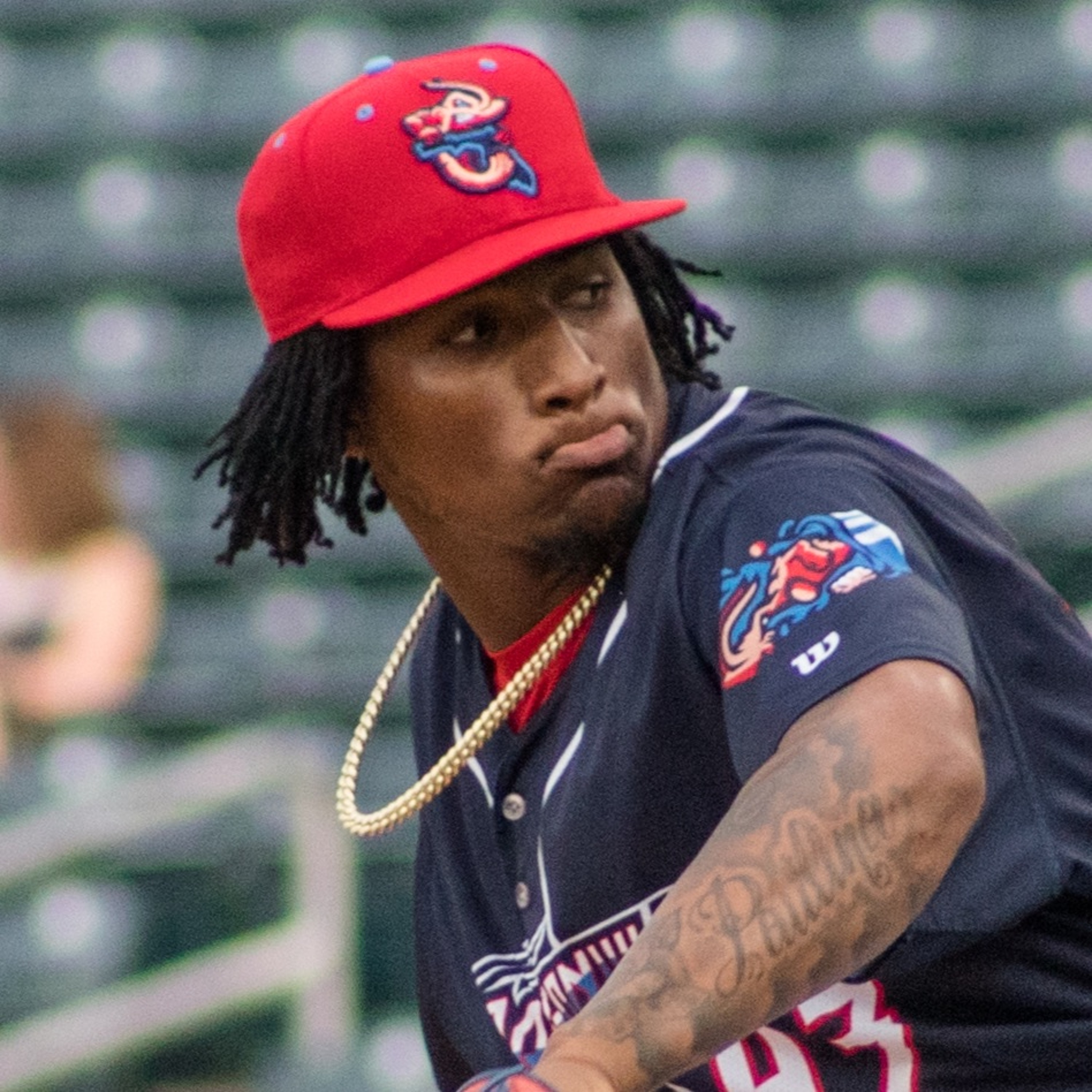 Roger Hoover interviews Jumbo Shrimp pitcher Sixto Sanchez, with bullpen coach Esmerling De La Rosa translating, in Montgomery on June 28, 2019.