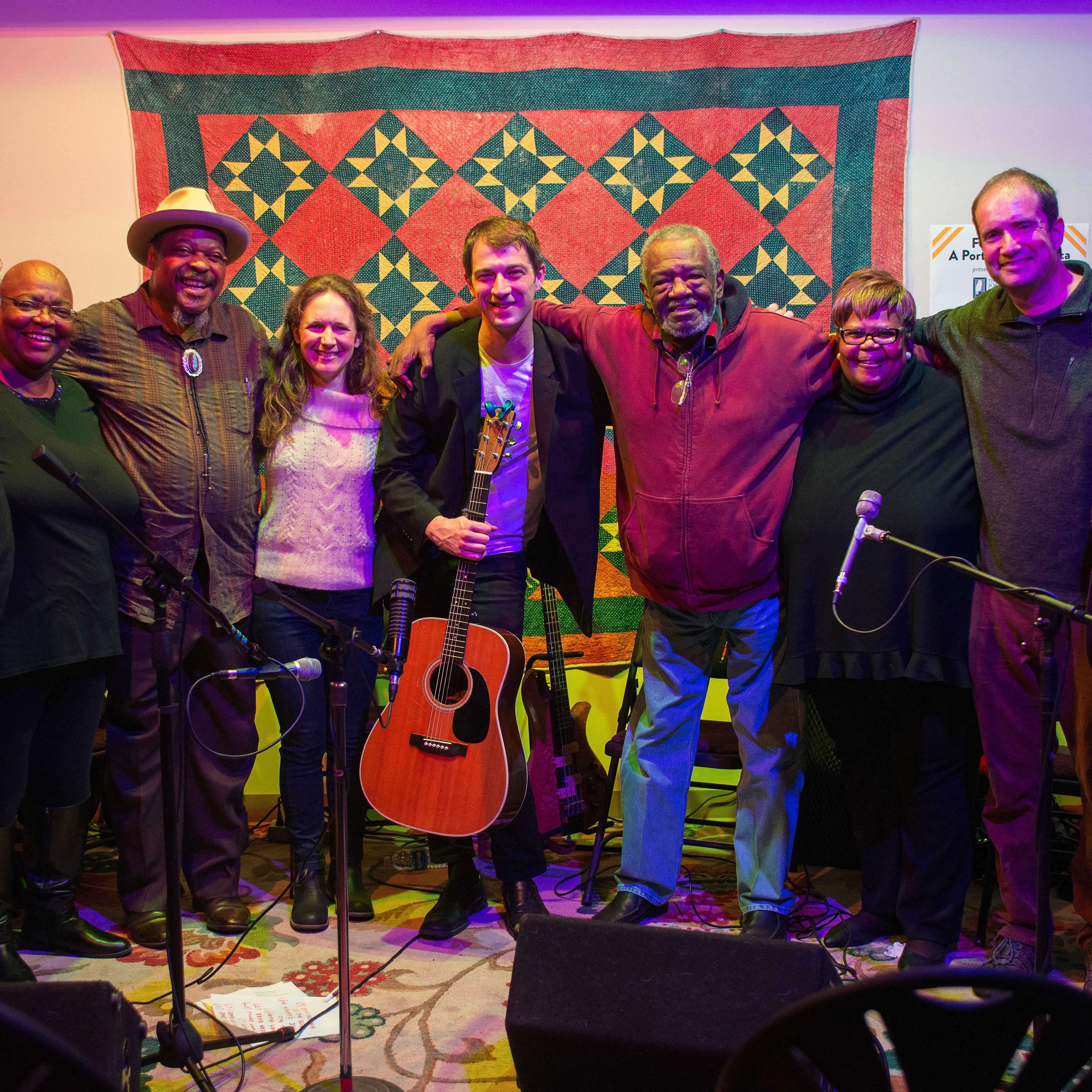 Sherman Holmes performs at the Front Porch in Charlottesville with Cora Harvey Armstrong, Phil Wiggins, Jared Pool and Almeta Ingram-Miller.