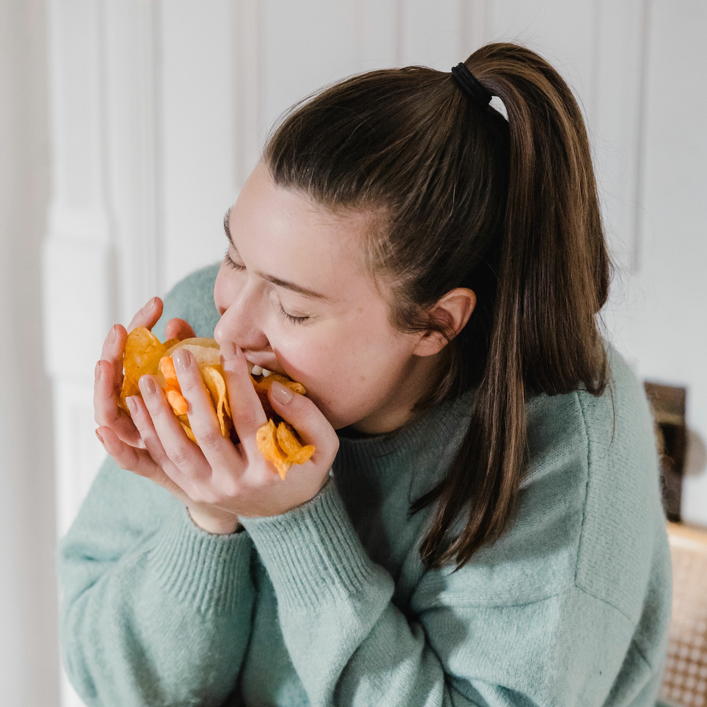 Photo by Tim Samuel: https://www.pexels.com/photo/woman-handful-of-unhealthy-chips-6697286/