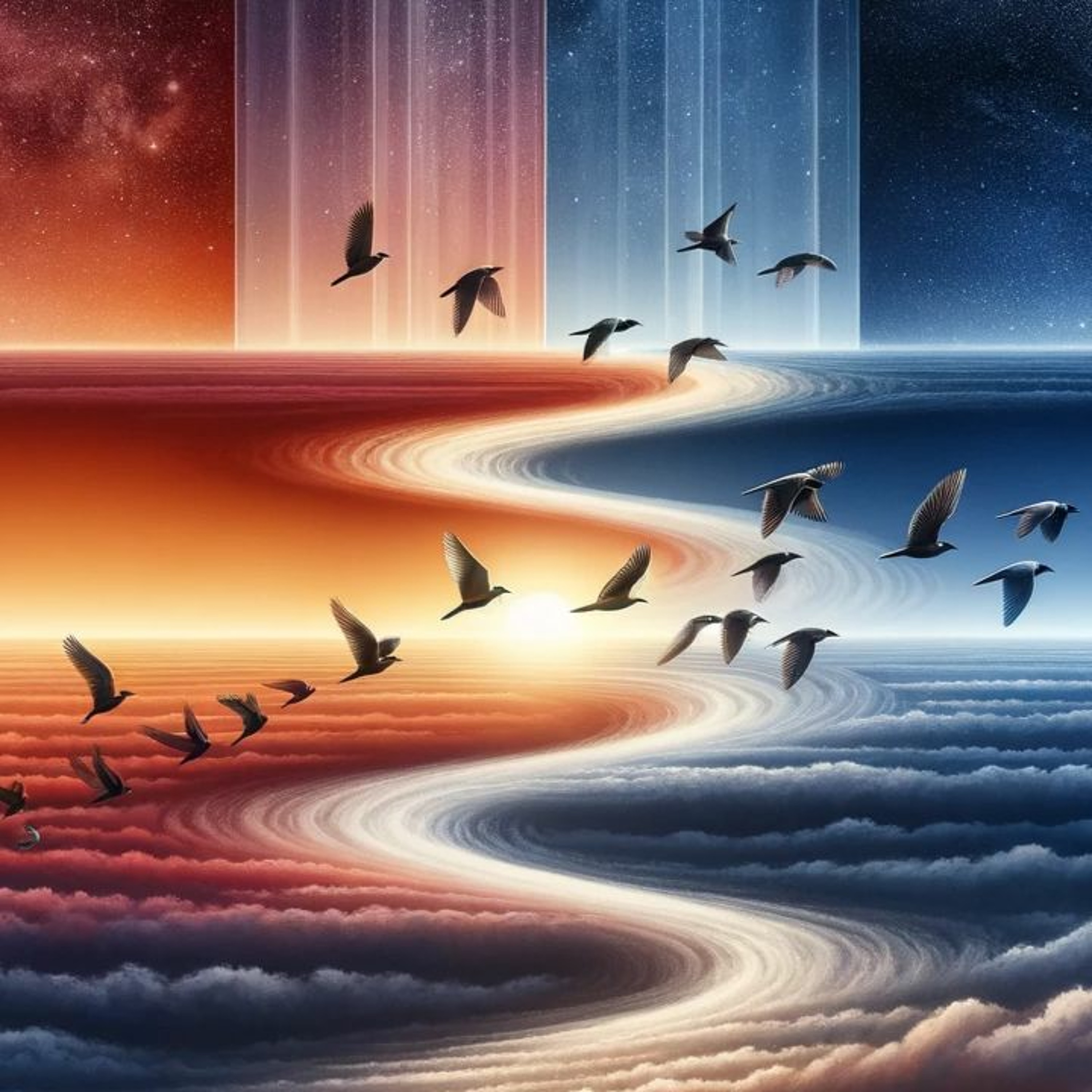 Image by Dall-E prompt “please create a close up picture of a flock of birds navigating between three different horizons. the birds are smart and know which why they need to go”