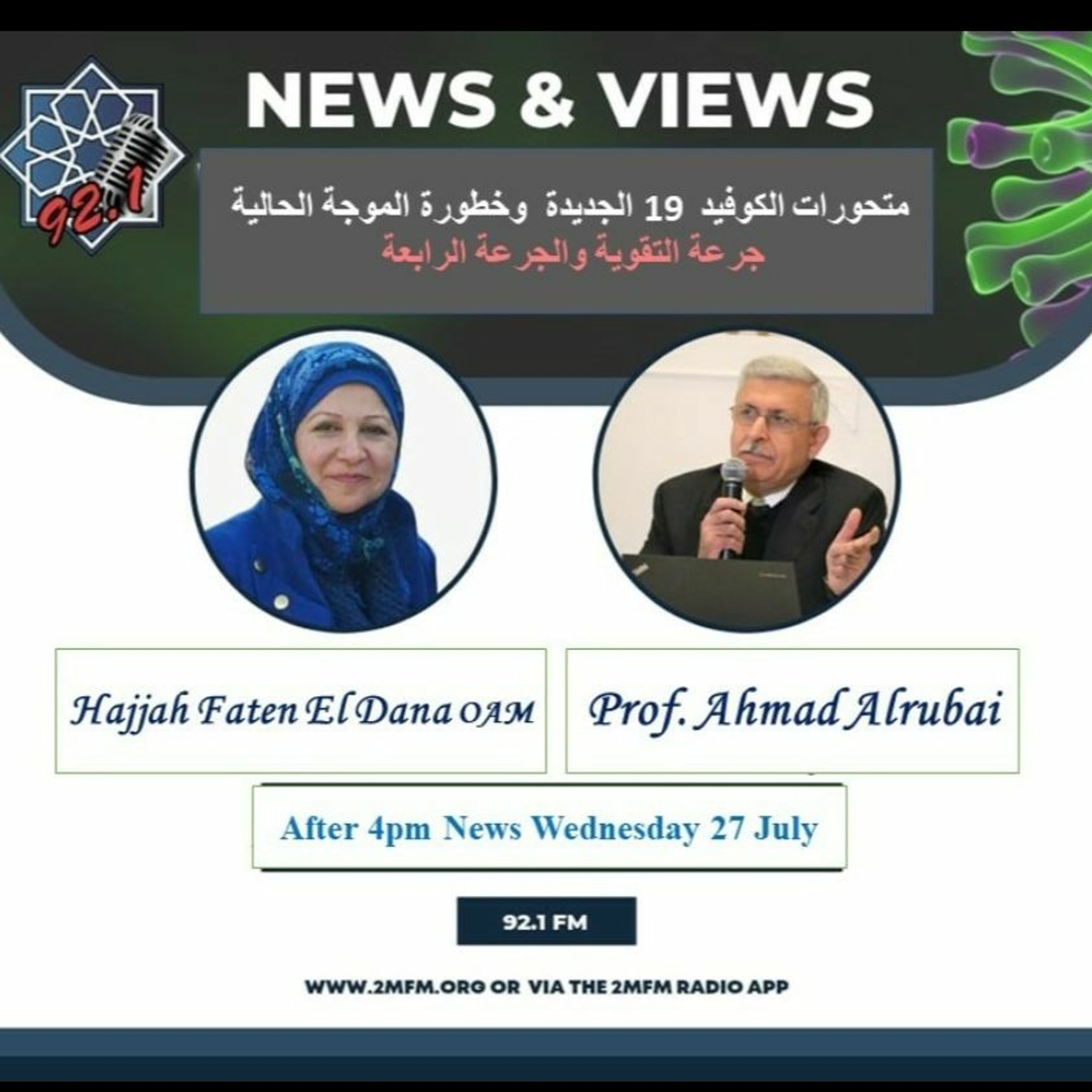معلومات مهمة تستمعون اليها عن متحورات الكوفيد 19 الجديدة وخطورة الموجة الحالية إضافة الى جرعة التقوية والجرعة الرابعة وذلك من خلال اللقاء الذي تجريه الحاجة فاتن الدنا مع البرفيسور أحمد الربيعي أخصائي الجهاز الهضمي والناضور والاستاذ في جامعة NSW يوم الاربعاء بعد أخبار الساعة الرابعة من بعد الظهر .