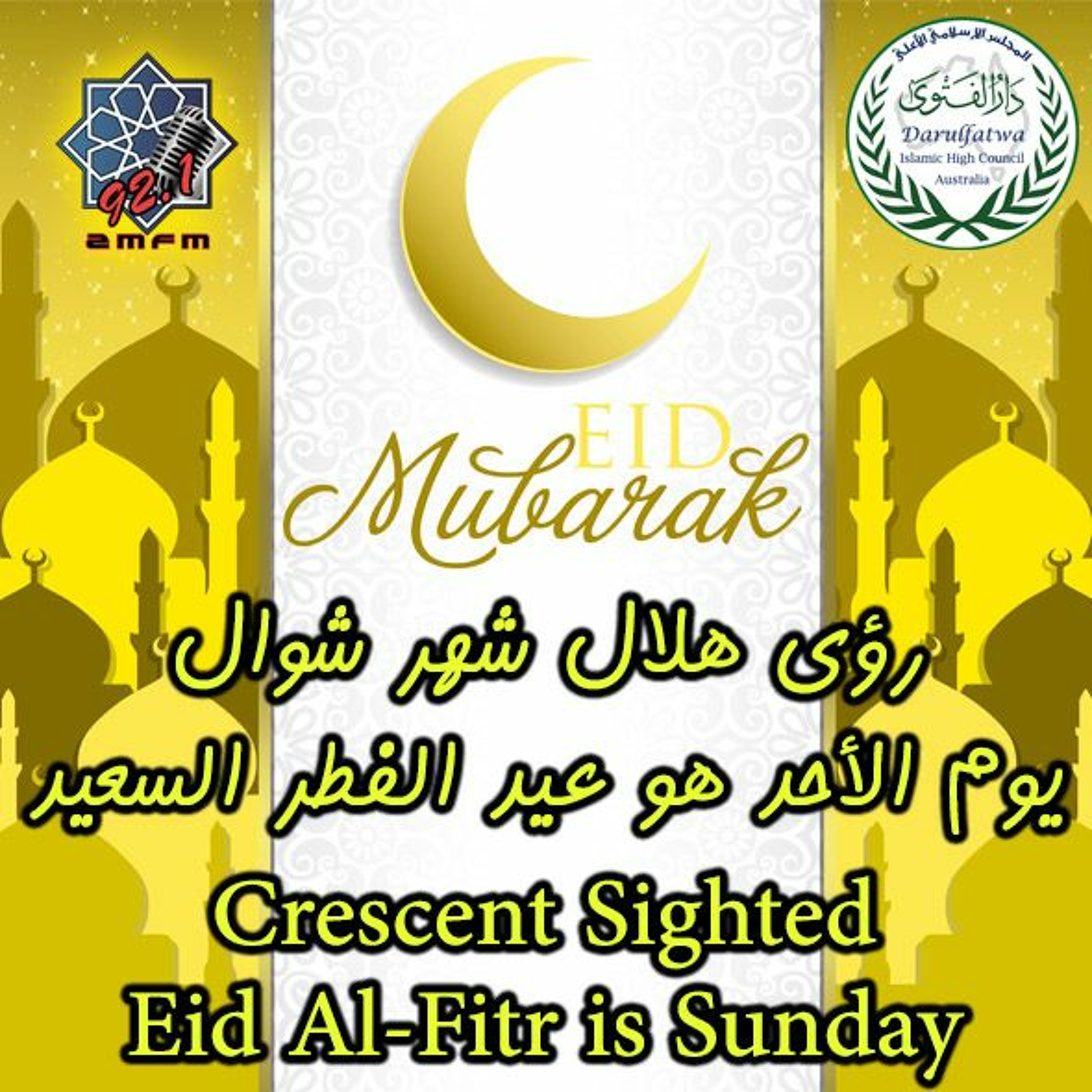 بسم الله الرحمن الرحيم -الحمد لله حق حمده والصلاة والسلام على نبينا محمد وعلى آله وصحبه وبعد فقد قال رسول الله صلى الله عليه وسلم : صوموا لرؤيته وأفطروا لرؤيته فإن غُمَّ عليكم فأكموا العدة ثلاثين. عملا بهذا الحديث الشريف نعلن لعموم المسلمين أنه قد ثبت شرعا لدى دار الفتوى في أستراليا أن يوم الأحد الخامس والعشرين من شهر حزيران يونيو - 25-06 - لهذا العام ألف وأربعمائة وثمانية وثلاثين 1438 ألفان وسبعة عشر 2017 هو يوم عيد الفطر السعيد أعاده الله علينا وعليكم وعلى جميع المسلمين بالخير واليمن والبركة.