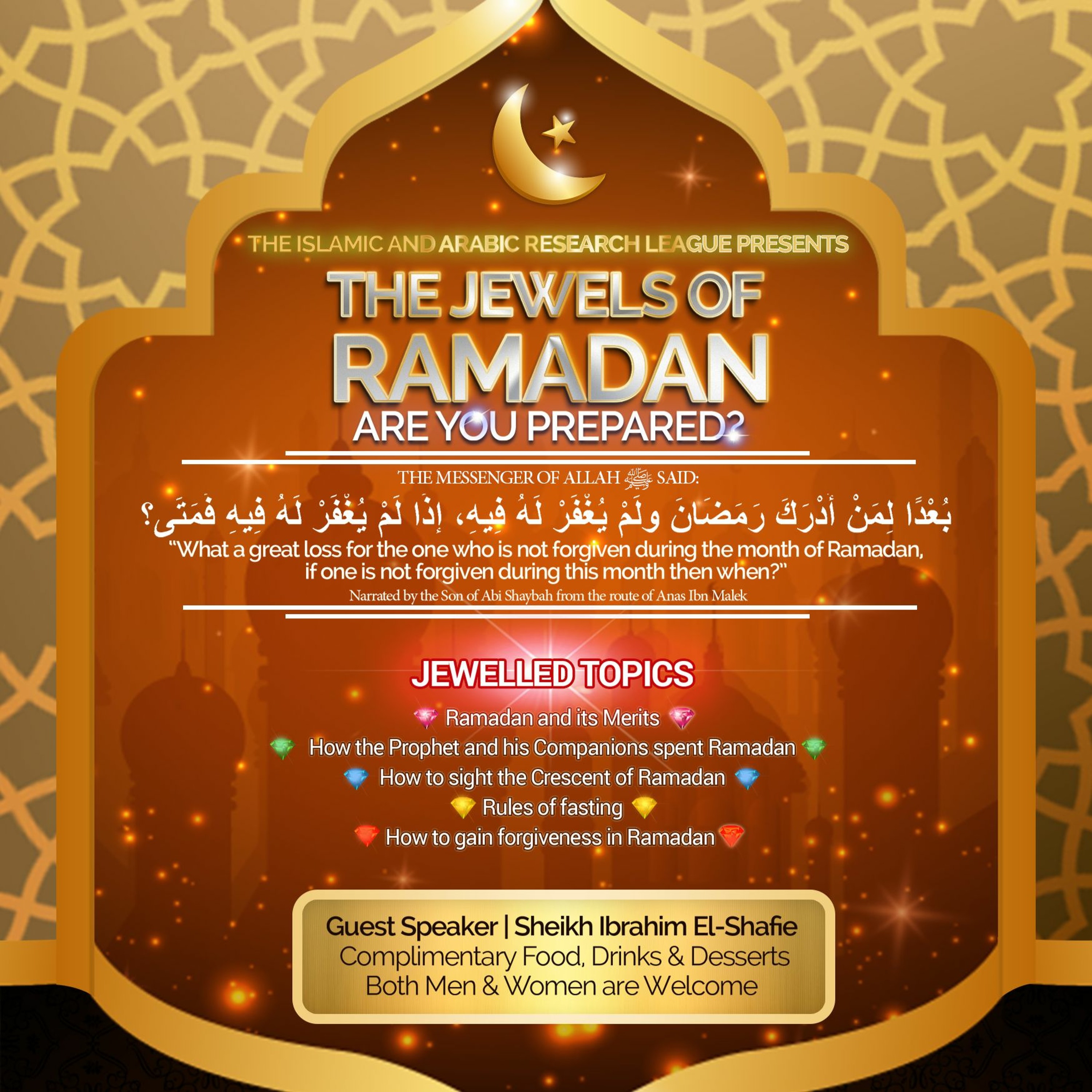 يدعوكم التجمع الإسلامي العربي للبحوث لحضور محاضرة دينية بعنوان الجواهر الرمضانية.