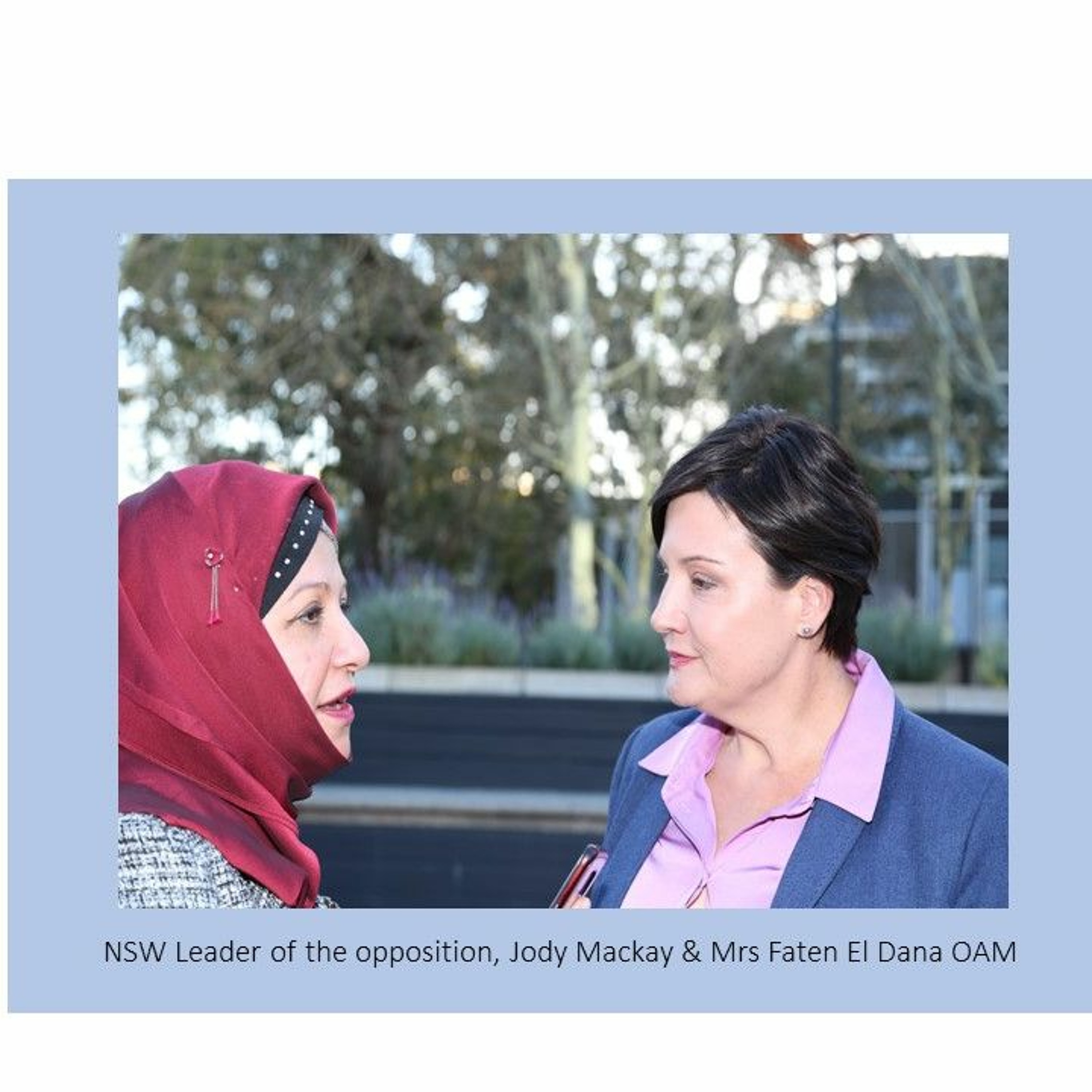 You can listen again to the special episode of News & Views program during which Hajjah Faten El Dana OAM conducted the first interview with the recently elected NSW Leader of the opposition Ms Jodi McKay MP who also holds the portfolio of Muliculturalism.