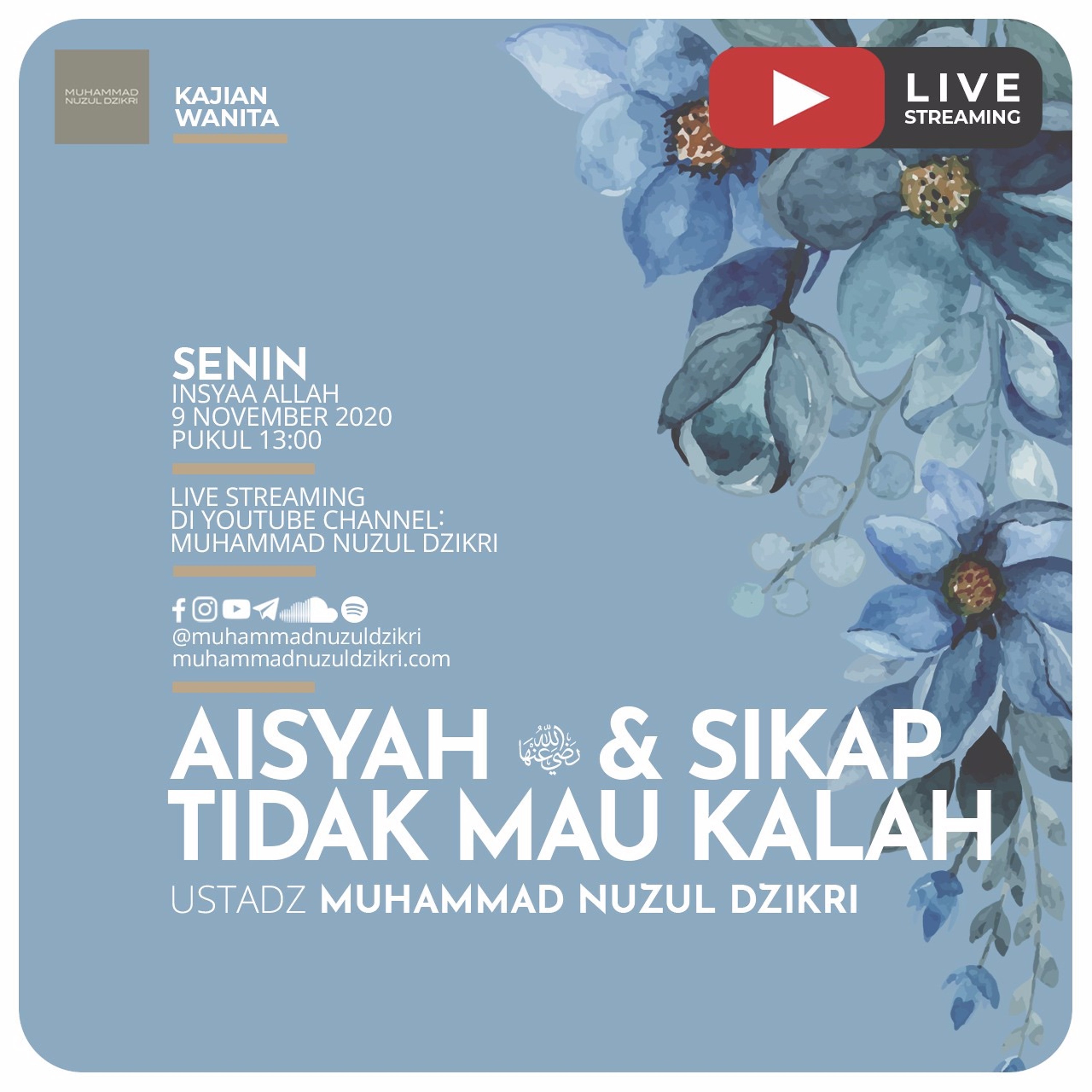 Kajian Wanita Insyaa Allah setiap Senin jam 13:00 Di Youtube Channel: Muhammad Nuzul Dzikri Bersama Ustadz Muhammad Nuzul Dzikri