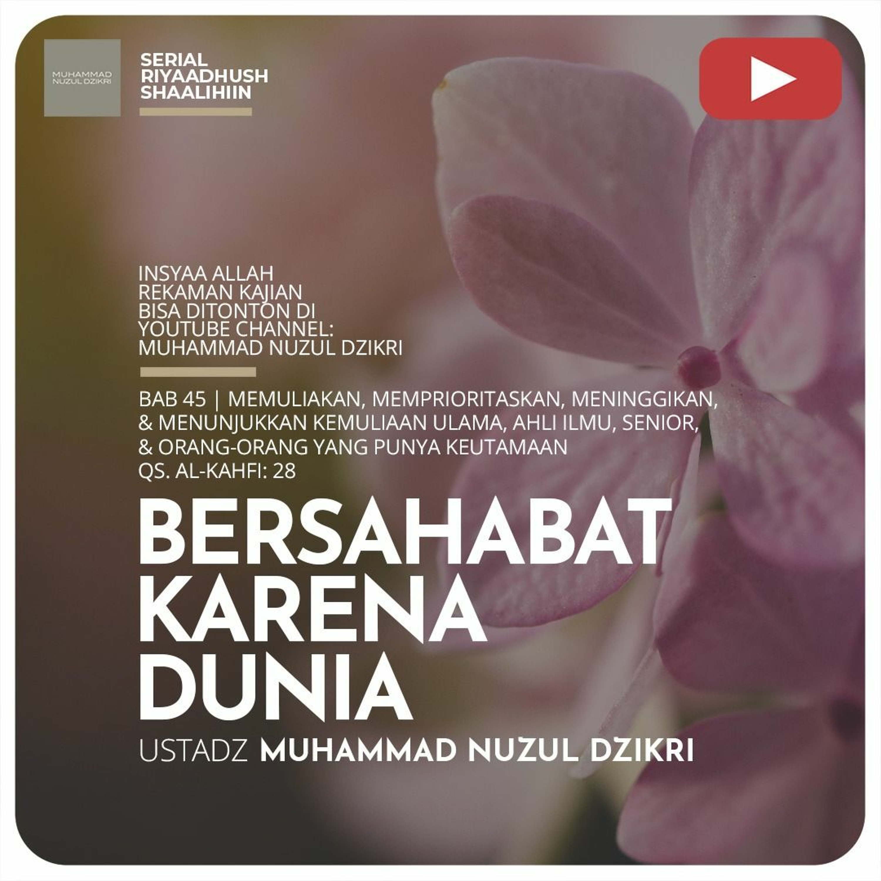 Dan bersabarlah kamu bersama-sama dengan orang-orang yang menyeru Tuhannya di pagi dan senja hari dengan mengharap keridhaan-Nya; dan janganlah kedua matamu berpaling dari mereka (karena) mengharapkan perhiasan dunia ini; dan janganlah kamu mengikuti orang yang hatinya telah Kami lalaikan dari mengingati Kami, serta menuruti hawa nafsunya dan adalah keadaannya itu melewati batas. (QS. Al-Kahfi: 28)
