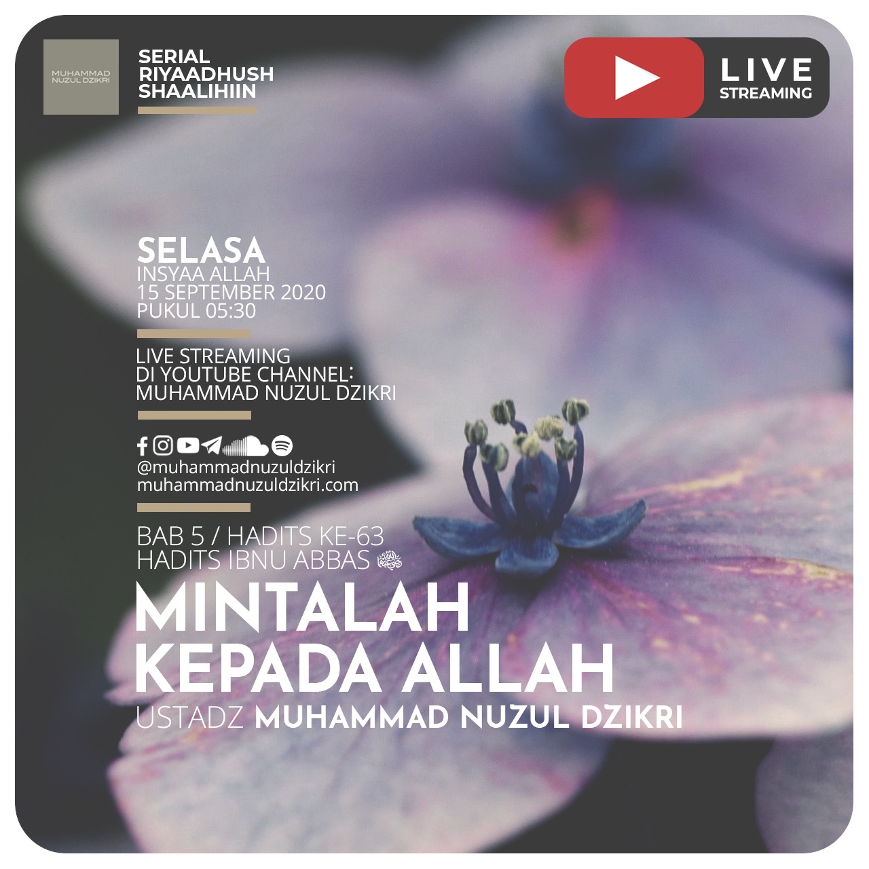 Abdullah bin ‘Abbas –radhiyallahu ‘anhuma– menceritakan, suatu hari saya berada di belakang Nabi shallallahu ‘alaihi wasallam. Beliau bersabda, “Nak, aku ajarkan kepadamu beberapa untai kalimat: Jagalah Allah, niscaya Dia akan menjagamu. Jagalah Allah, niscaya kau dapati Dia di hadapanmu. Jika engkau hendak meminta, mintalah kepada Allah, dan jika engkau hendak memohon pertolongan, mohonlah kepada Allah. Ketahuilah, seandainya seluruh umat bersatu untuk memberimu suatu keuntungan, maka hal itu tidak akan kamu peroleh selain dari apa yang telah Allah tetapkan untukmu. Dan andaipun mereka bersatu untuk melakukan sesuatu yang membahayakanmu, maka hal itu tidak akan membahayakanmu kecuali apa yang telah Allah tetapkan untuk dirimu. Pena telah diangkat dan lembaran-lembaran telah kering.” (HR. Tirmidzi, hasan shahih)