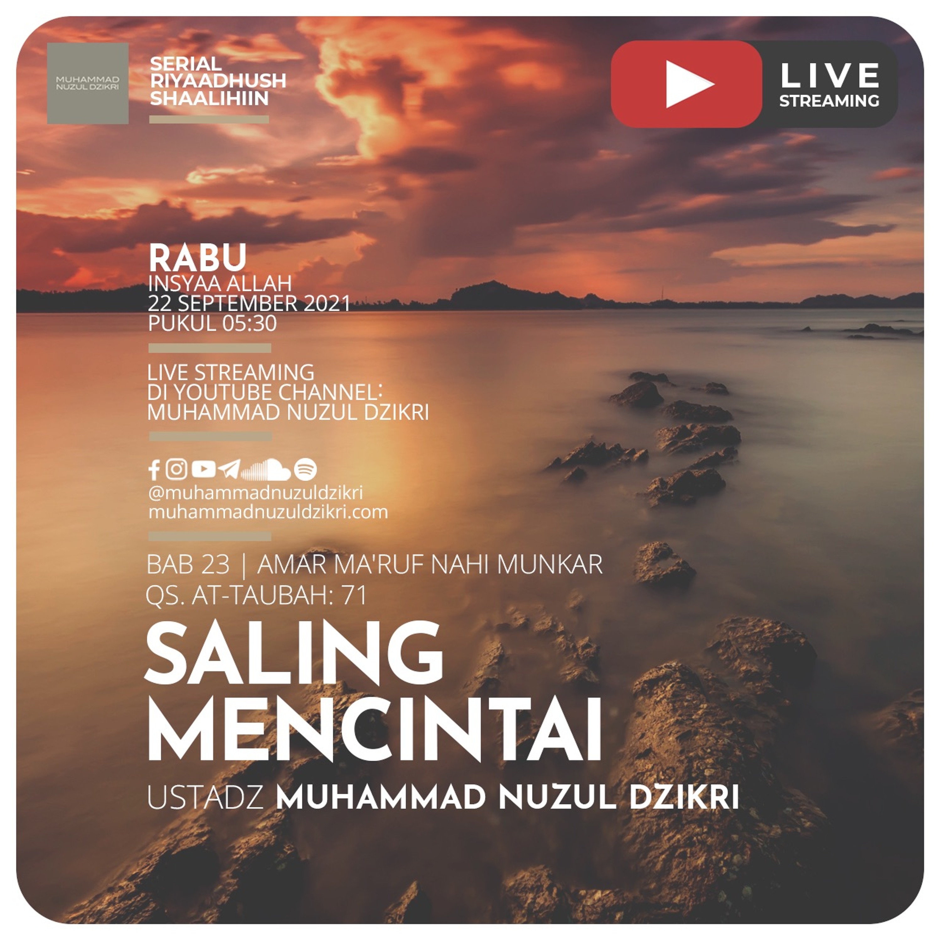 Dan orang-orang yang beriman, lelaki dan perempuan, sebahagian mereka (adalah) menjadi penolong bagi sebahagian yang lain. Mereka menyuruh (mengerjakan) yang ma'ruf, mencegah dari yang munkar, mendirikan shalat, menunaikan zakat dan mereka taat pada Allah dan Rasul-Nya. Mereka itu akan diberi rahmat oleh Allah; sesungguhnya Allah Maha Perkasa lagi Maha Bijaksana. (QS. At-Taubah: 71)