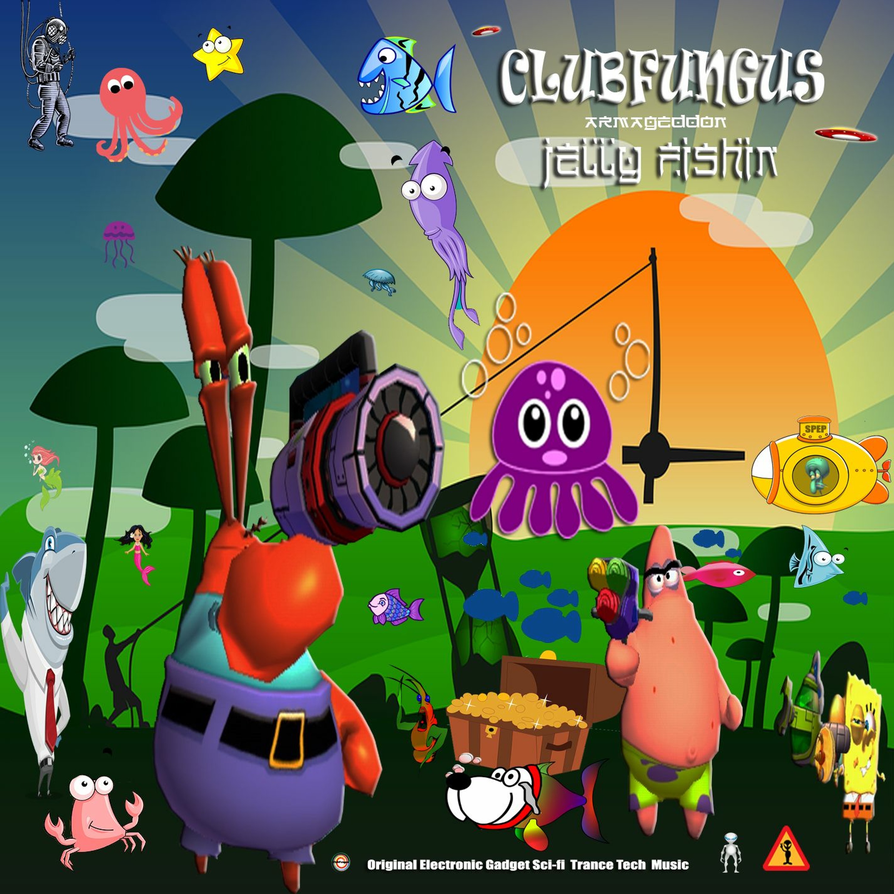 Join Mr Krabs, Patrick and Spongebob as they search and hunt down to capture the elusive and highly deadly dangerous armagedon jelly fish real name Bubbles now threatening to wipe out the entire universe unless it can be absorbed back into the jelly dimension with the aid of fungus infused weaponary will they succeed as the terrain is difficult in the vast expanse of the mystyical sea orb fungus forests were time and reality warps and squidward has legged it in the scardy pants escape pod, let you imagination run wild and i hope you enjoy this original foot stomping mysterious fun psychedelic electro swagger and tranced tribal tech tripped out gaming instrumental journey vibe! Cheers Peace! :D