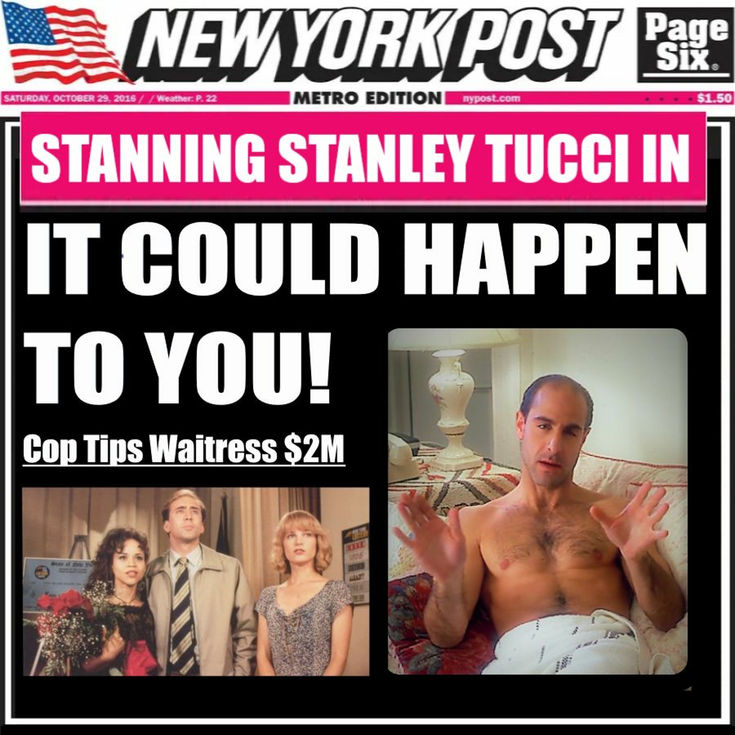 Tucci plays a deadbeat, pathological liar, ex-husband to a waitress who gets a surprise tip of 2 million dollars from Nic Cage, who plays a lottery winner and the greatest cop in NYC. Is this movie Tucci's most naked role? Literally? And is it a hidden gem or a piece of propaganda for the New York Post? Find out in another Stanning Stanley Tucci!!!
