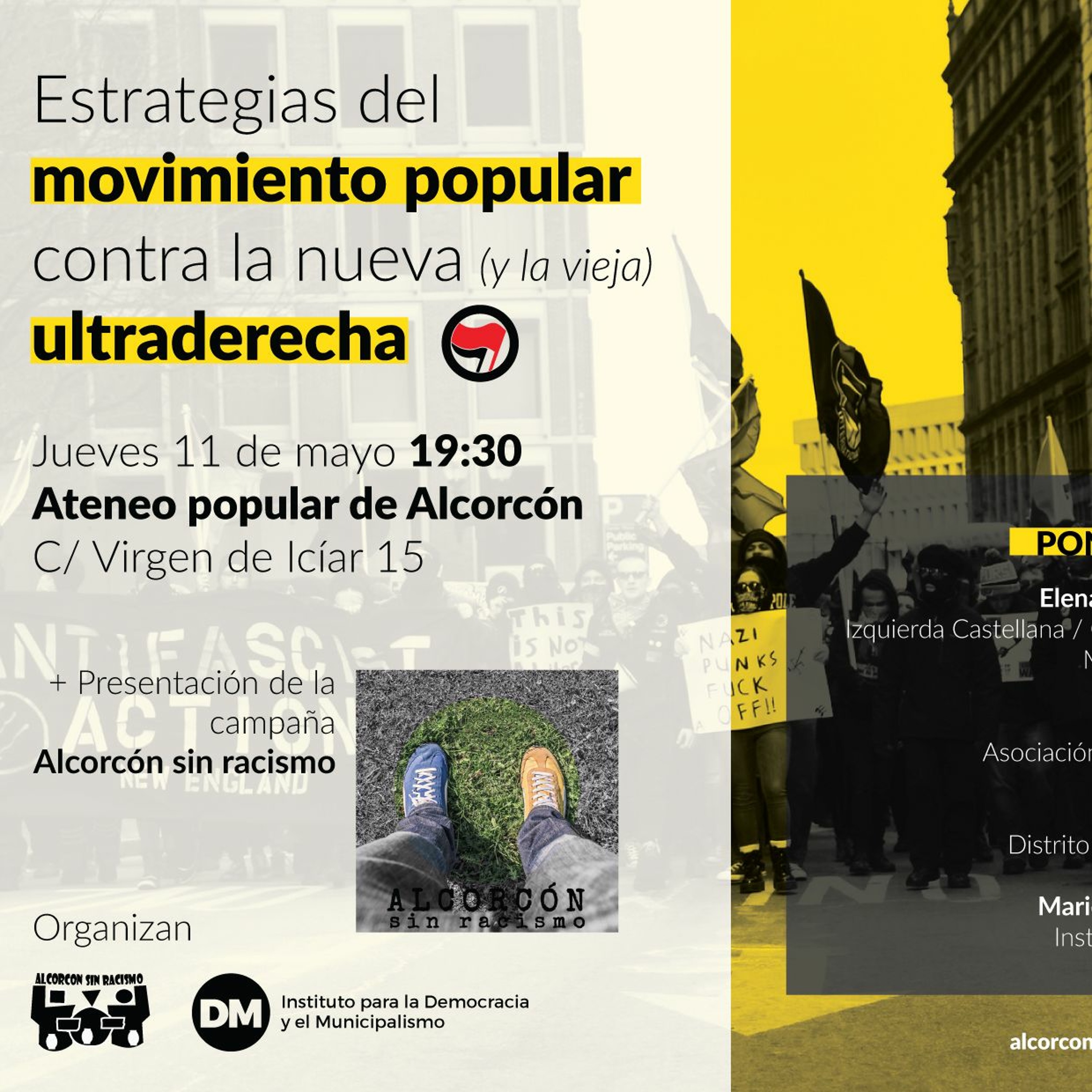 El pasado jueves 11 de mayo de 2017 se estrenó la campaña Alcorcón Sin Racismo en un acto organizado en colaboración con el Instituto DM en un acto en el Ateneo Popular de Alcorcón con las ponentes:
