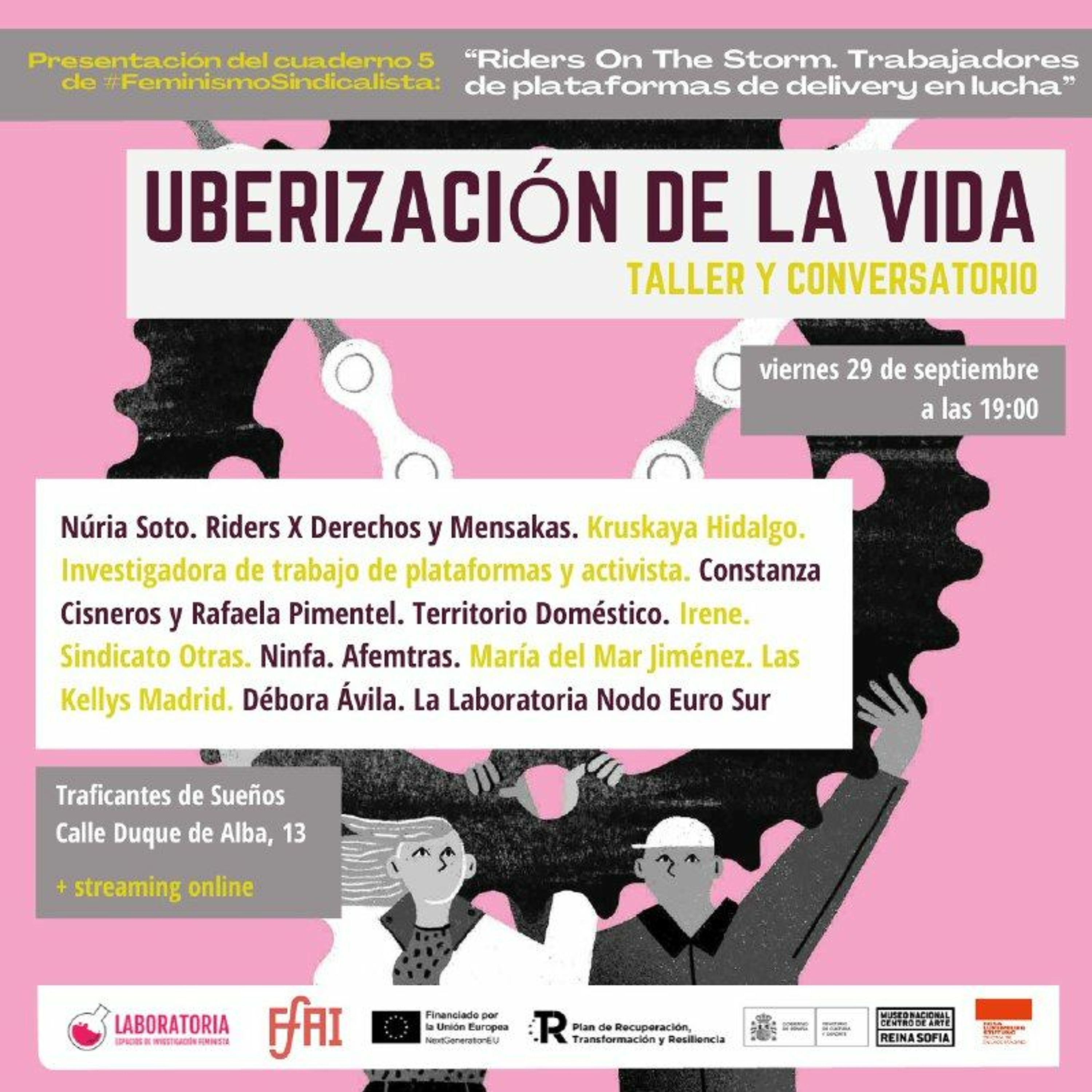 Con la participación de Kruskaya Hidalgo, investigadora del trabajo de plataforma y activista; Constanza Cisneros y Rafalea Pimentel, de Territorio Doméstico; Irene, del Sindicato Otras; Ninfa, de Afemtras; María del Mar Jiménez, de Las kellys Madrid; y Débora Avila, de La Laboratoria Nodo EuroSur.