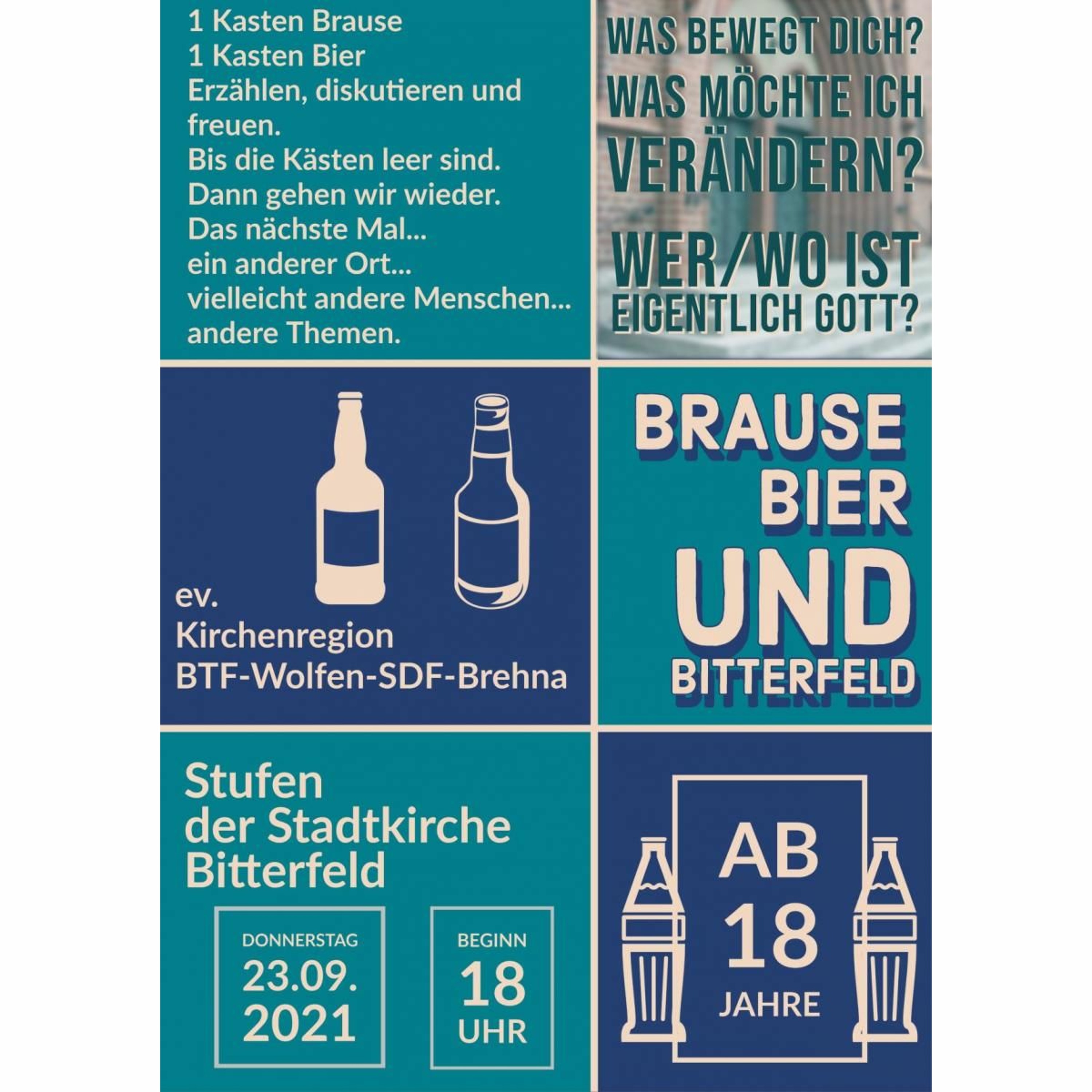 Auf die Stufen, fertig, los. Unter dem Motto: Brause, Bier und Bitterfeld laden Pfarrer Martin Kabitzsch und Pfarrerin Anna Mittermayer heute Abend ein auf die Stufen der Bitterfelder Stadtkirche. Ein lockeres, offenes Angebot: