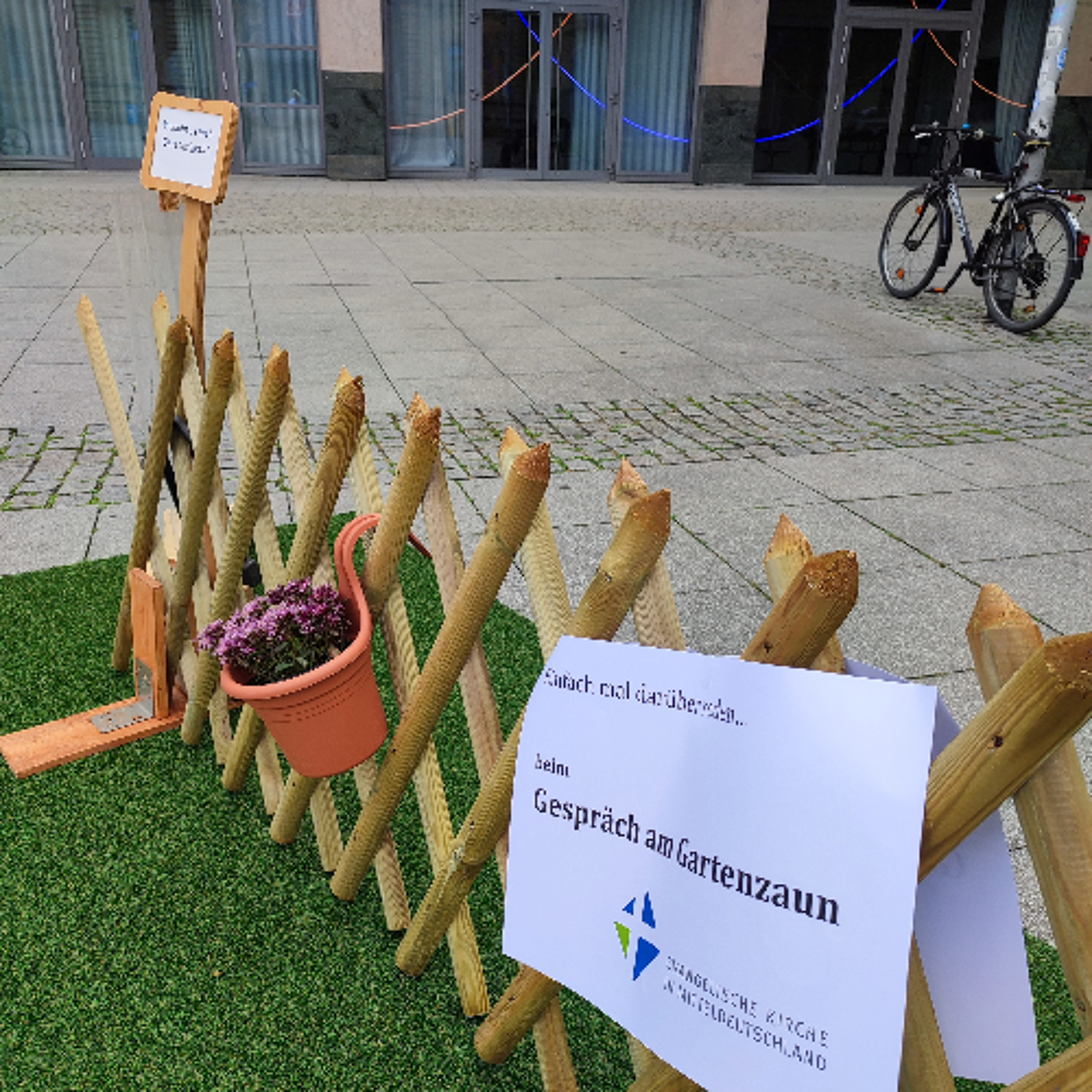 Zwei Meter Gartenzaun und ein Stück Kunstrasen. Das ist der Aufbau für das Gesprächsformat „Am Gartenzaun.“ Eine Idee aus der Evangelischen Akademie in Wittenberg, um miteinander ins Gespräch zu kommen.