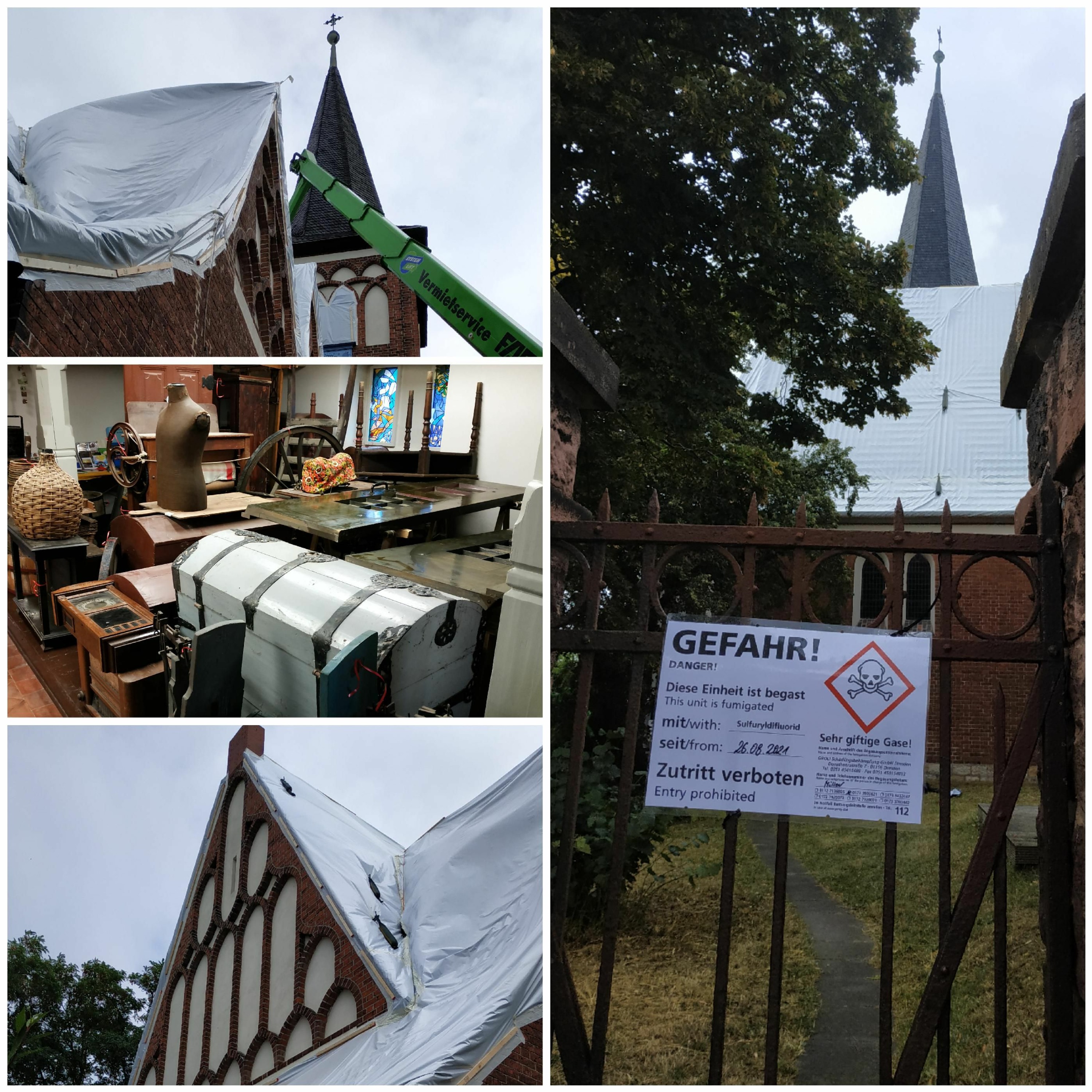 Seit Freitag war die Reformationskirche im Magdeburger Stadtteil Rothensee jetzt eingepackt in weiße Folie. Der gemeine Nagekäfer, auch als Holzwurm bekannt, war der Grund: