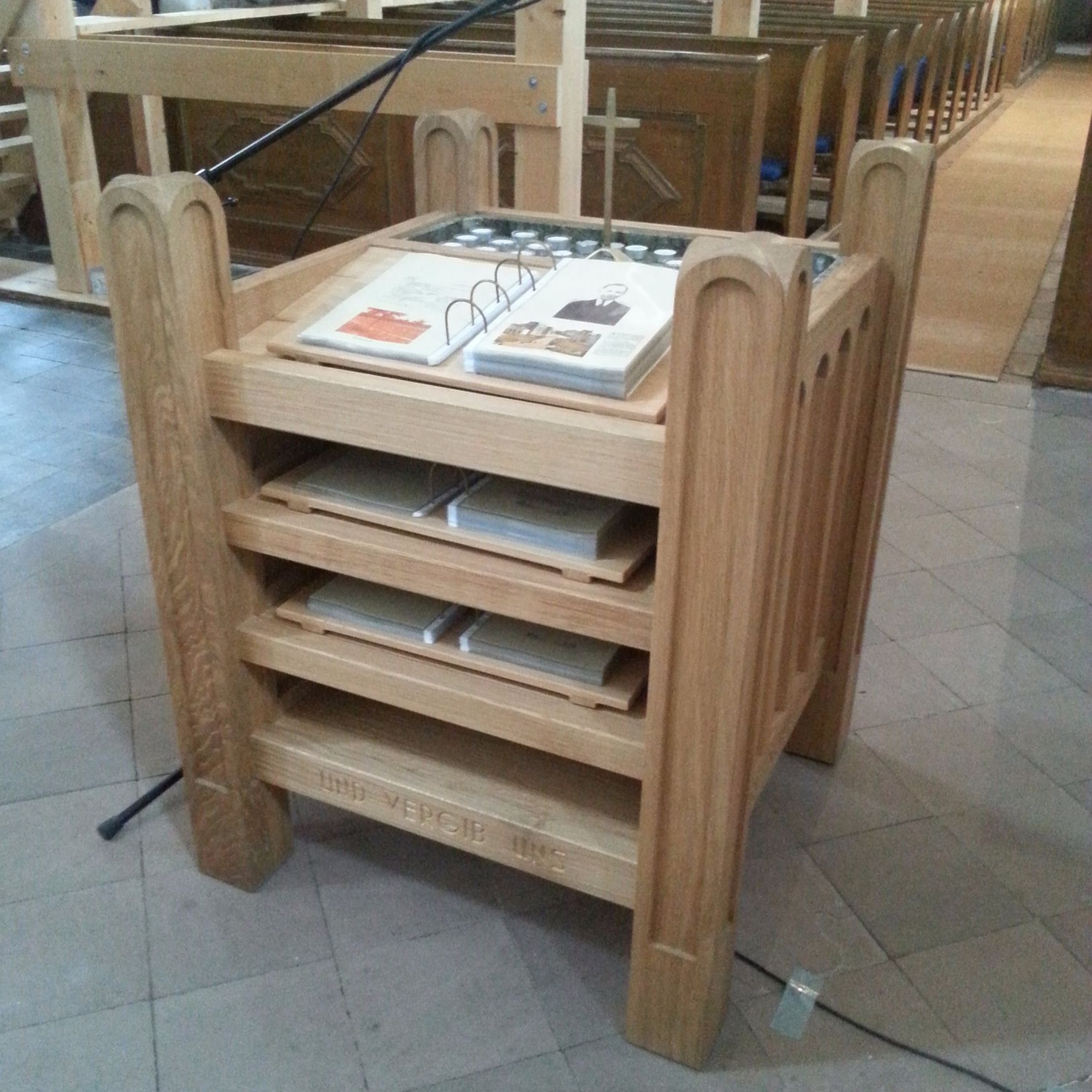 Bild: Friedensaltar in der Kirche St. Marien und Willebord in Schönhausen. Die Ordner enthalten - soweit bekannt - eine Dokumentation über alle in Kriegen gefallenen Schönhauser Soldaten oder in Schönhausen während der Kriege umgekommenen Menschen.