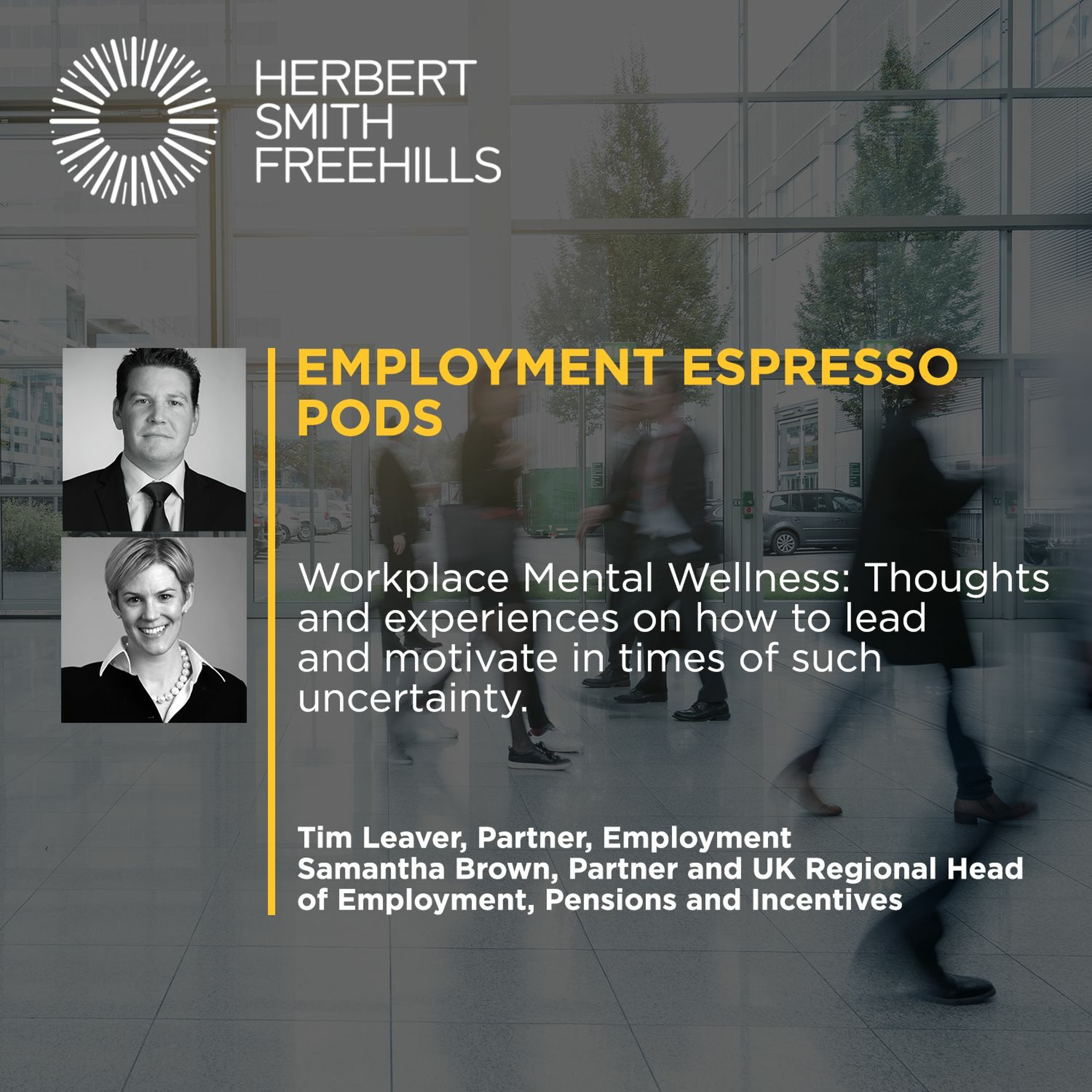 To mark Mental Health Awareness Week #MHAW21, Tim Leaver is joined by Sam Brown, a partner in our Pensions team and UK Regional Head of Employment, Pensions & Incentives for a discussion on workplace mental health and wellness, how the pandemic has impacted our wellbeing and awareness of our mental health and they share tips and personal experiences of how as leaders they are mindful of this and have motivated their teams.