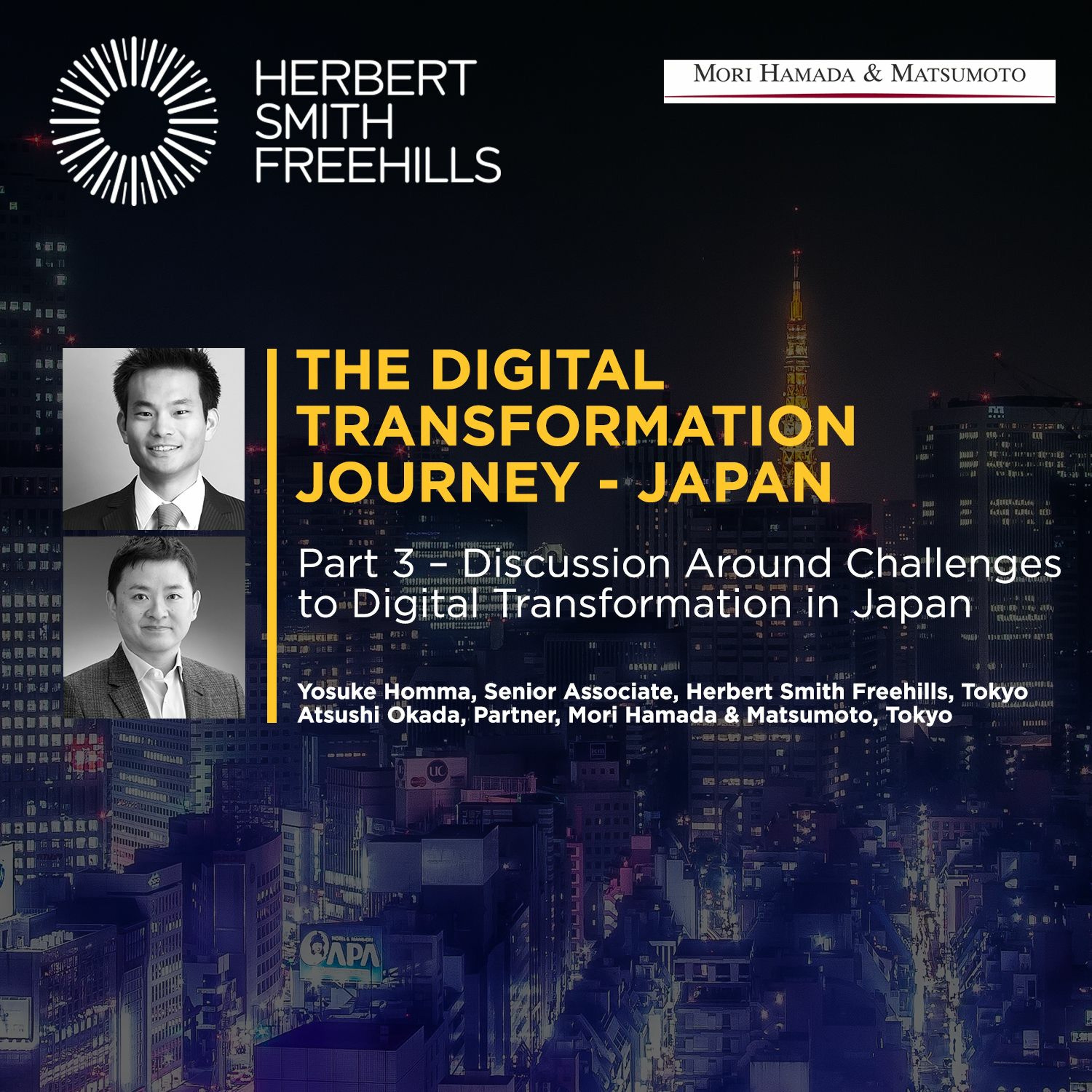 In Part 3 of this podcast series on Digital Transformation, Yosuke Homma from Herbert Smith Freehills' Tokyo office (a member of HSF's Digital Law Group) is joined by Atsushi Okada, a partner at Mori Hamada & Matsumoto to discuss some of the recent changes to the legal and regulatory framework in Japan that may be relevant for digital transformation, some Japan specific challenges to implementing digital transformation projects, and the trends we may see as digital transformation gathers pace in Japan.