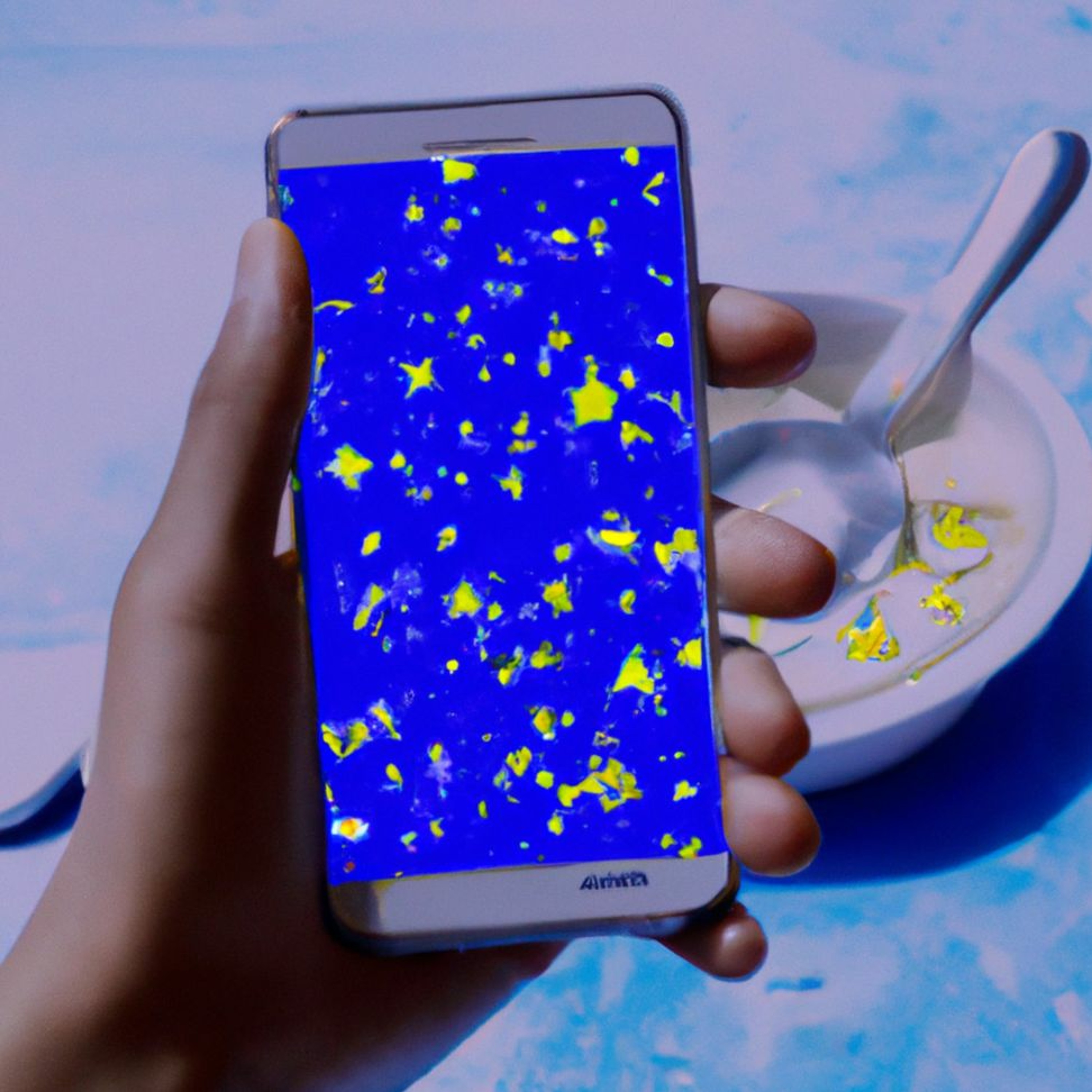 a photo of a hand over a sea of stars holding a mobile phone that is running an application that washes dishes but is malfunctioning.png