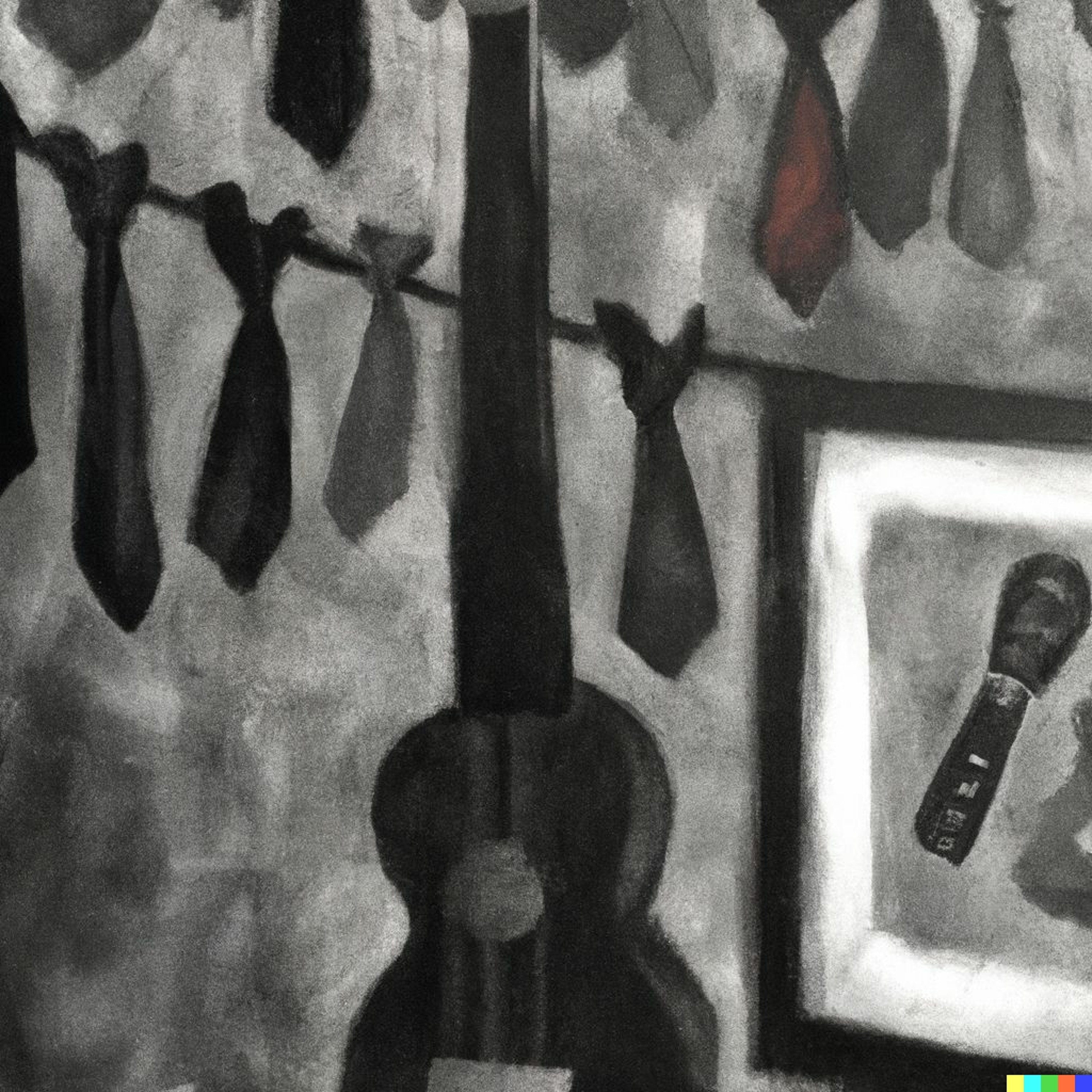 a charcoal drawing of a ukulele taped on to a canvas with an impressionist painting, the canvas is hanging in a room filled with guitars wearing neckties