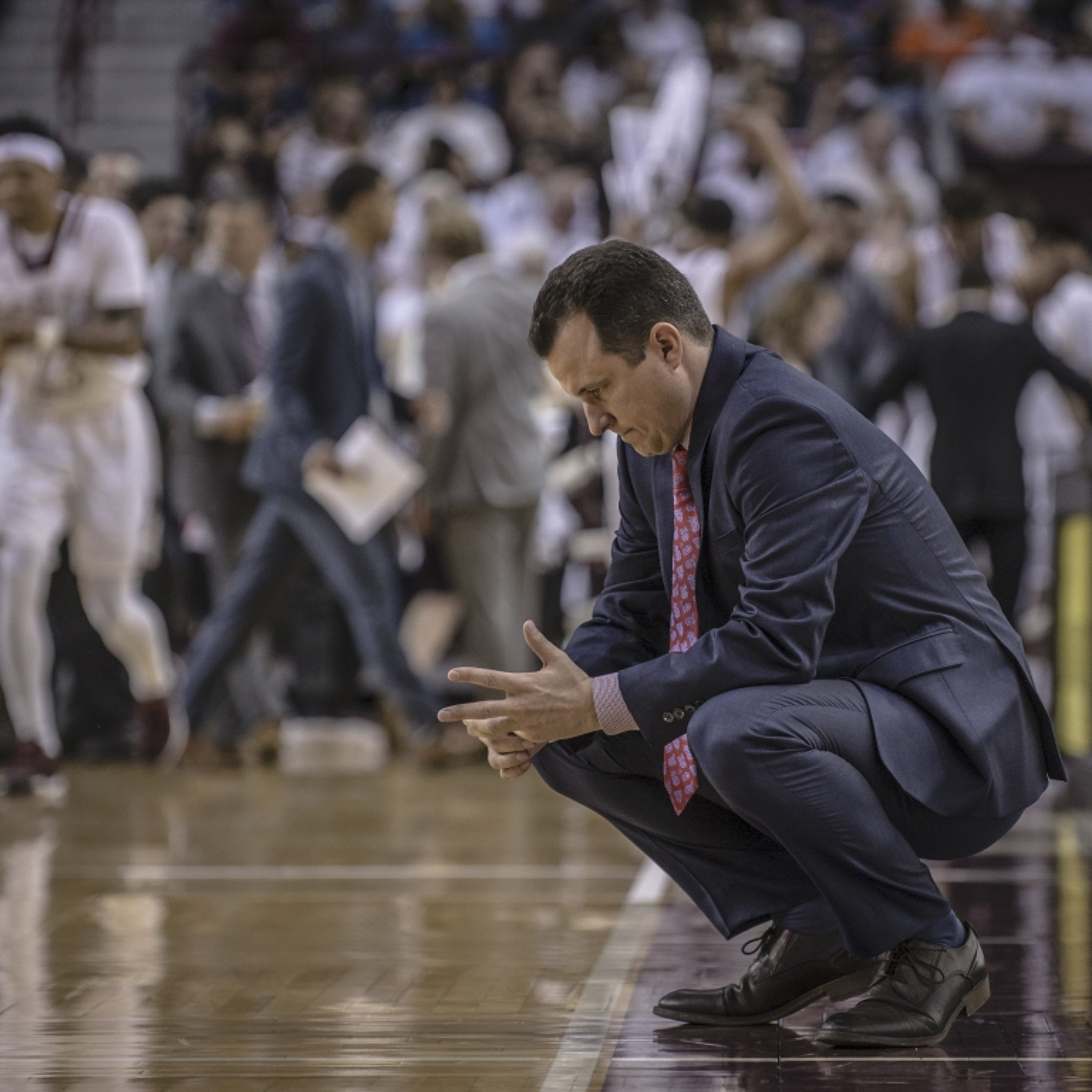 UNM Men's basketball coach Paul Weir sits on the sidelines as the Aggies celebrate their victory over the Lobos.