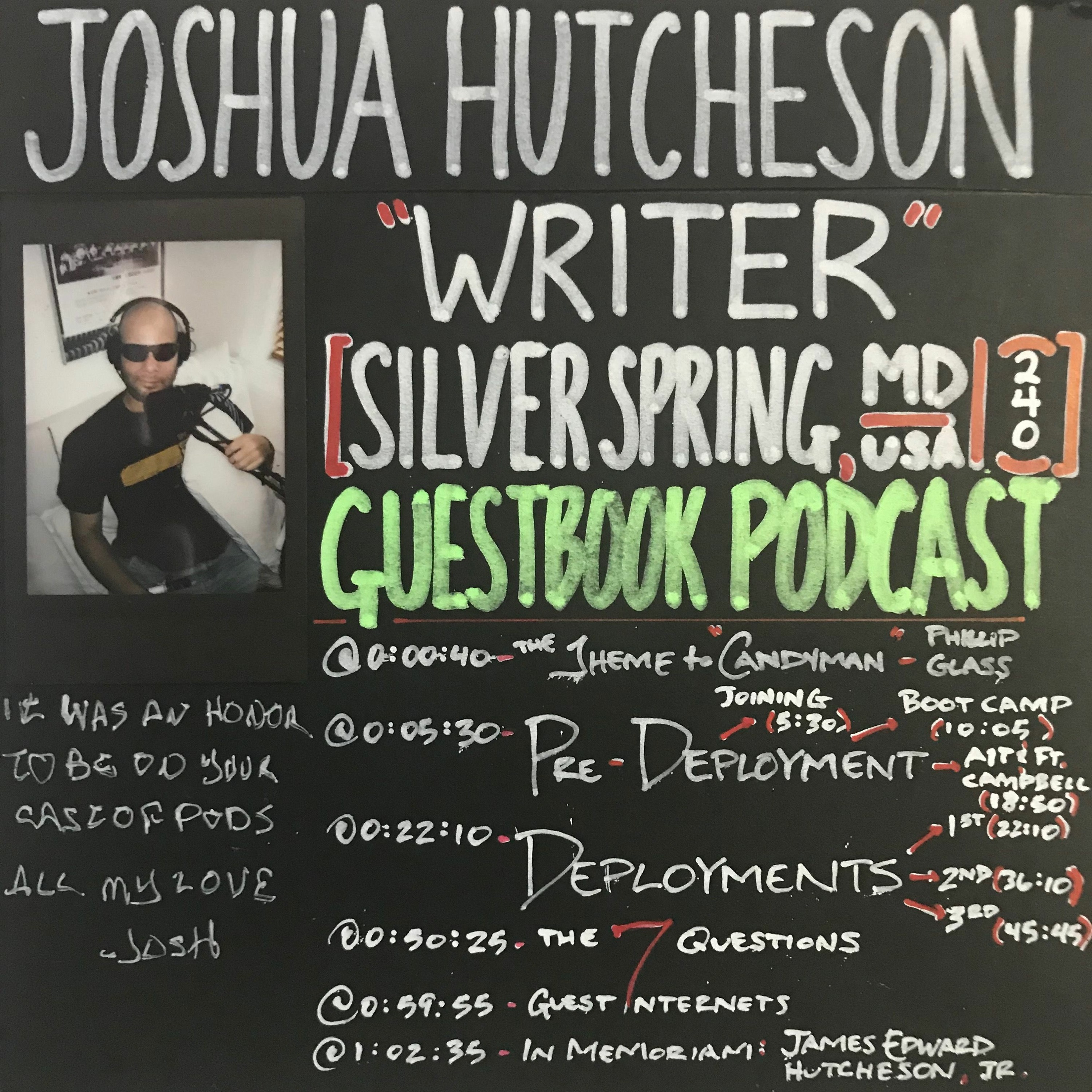 Episode 69 of Guestbook Podcast. At long last, long-time friend of the pod (and wittiest of them all ;-), Joshua Hutcheson graces Guestbook Podcast to recount his years of active duty in the US Army during the aughts. From boot camp (where he got 'smoked'...not like that though ;-), to Ft. Campbell (where he played the 'Sarah Huckabee Sanders' of the base), to his 1st deployment (where he saw his first dead body), to his 2nd deployment (where he became a celebrity magazine columnist), to his 3rd deployment (where he coordinated ‘embeds’ for civilian journalists…especially the French)…listen as he provides an inside look at the War in Iraq.