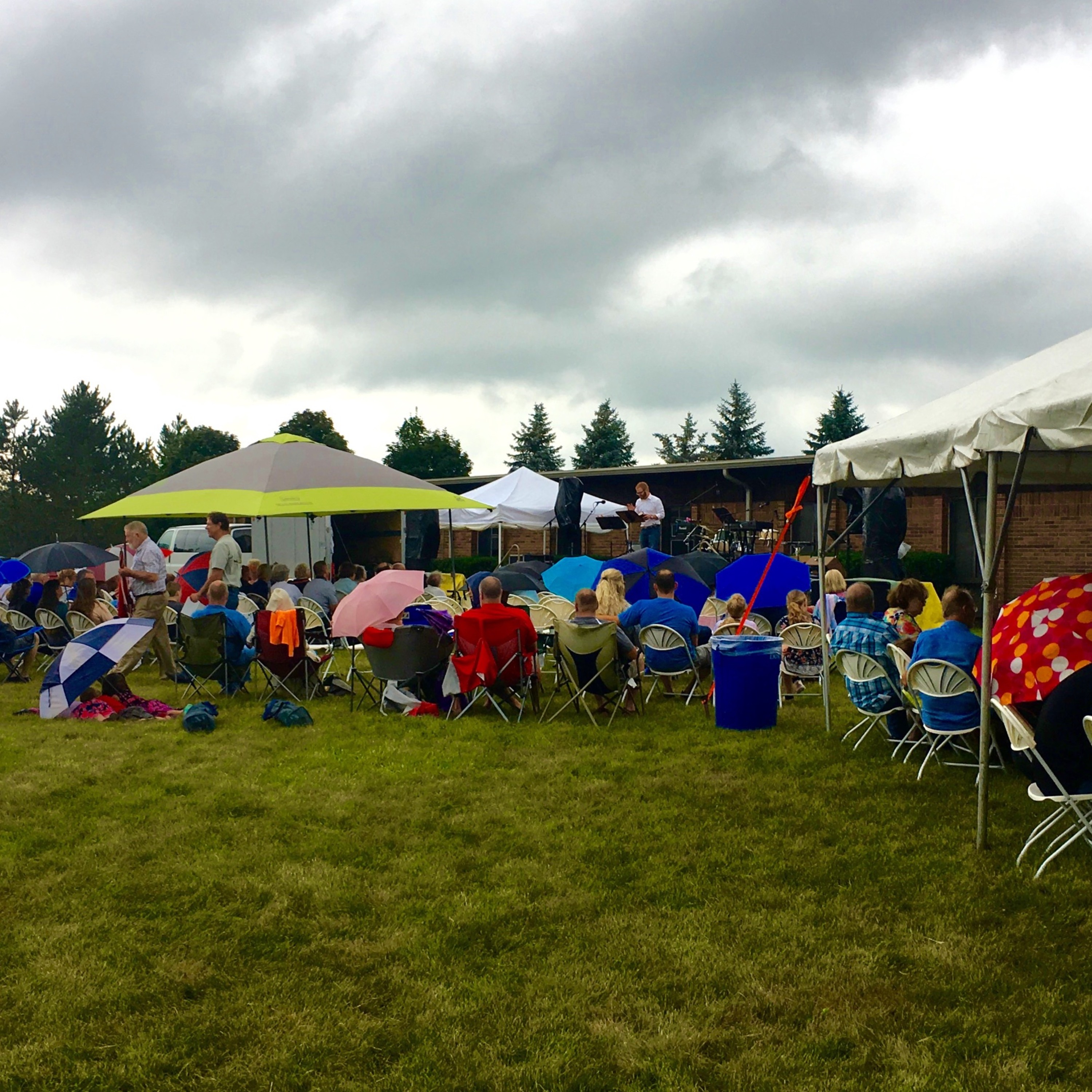 Pastor Phil preaches the gospel under the gray sky in a light drizzle.