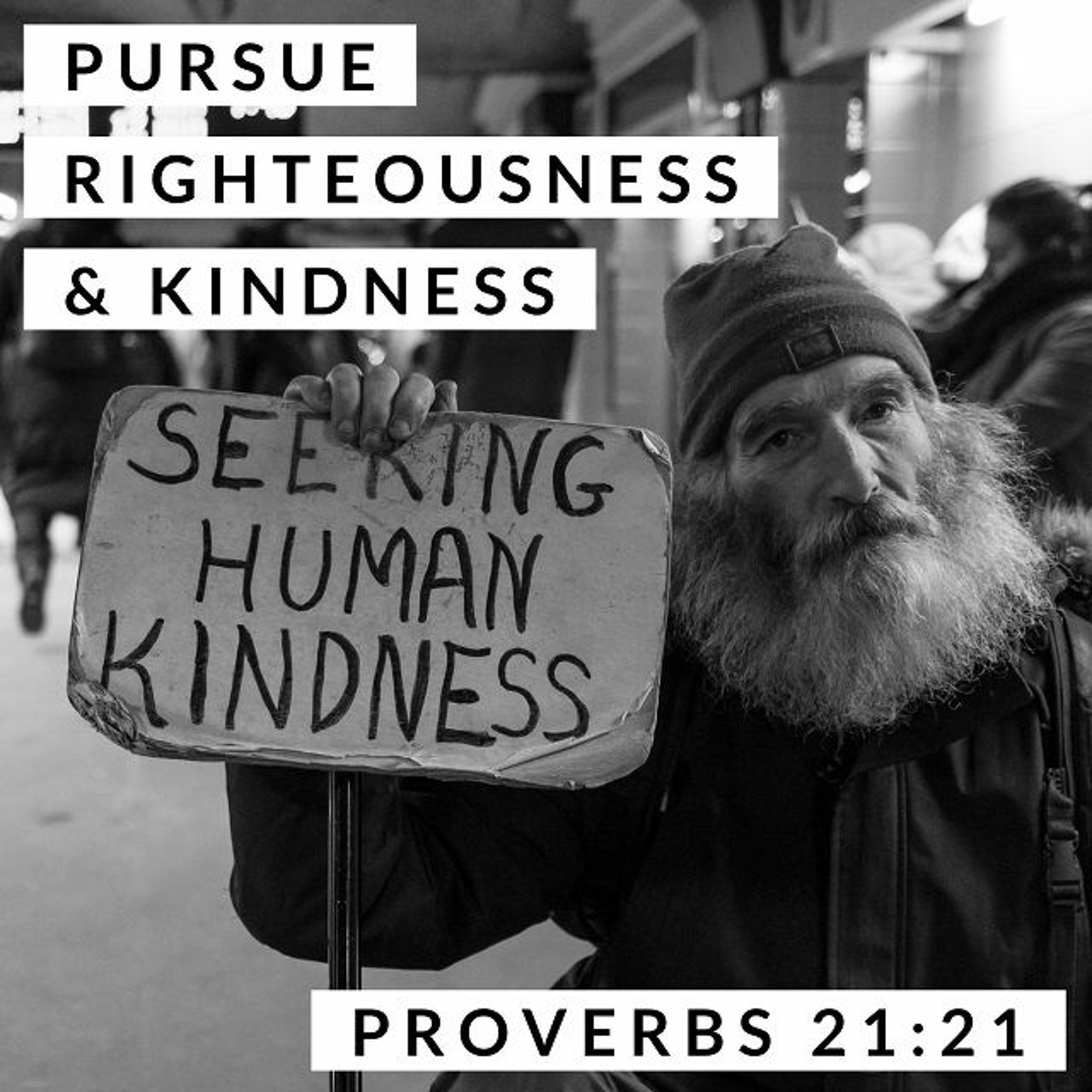 But Proverbs 21:21 calls to us, "Whoever pursues righteousness and kindness . . . " We may not do well with righteousness, but we know what kindness is! From childhood, we're taught to be kind. So what happens when we put kindness and righteousness together? I think we get a better understanding of what God calls us to, and we start defining those "Christianese" words with our love.