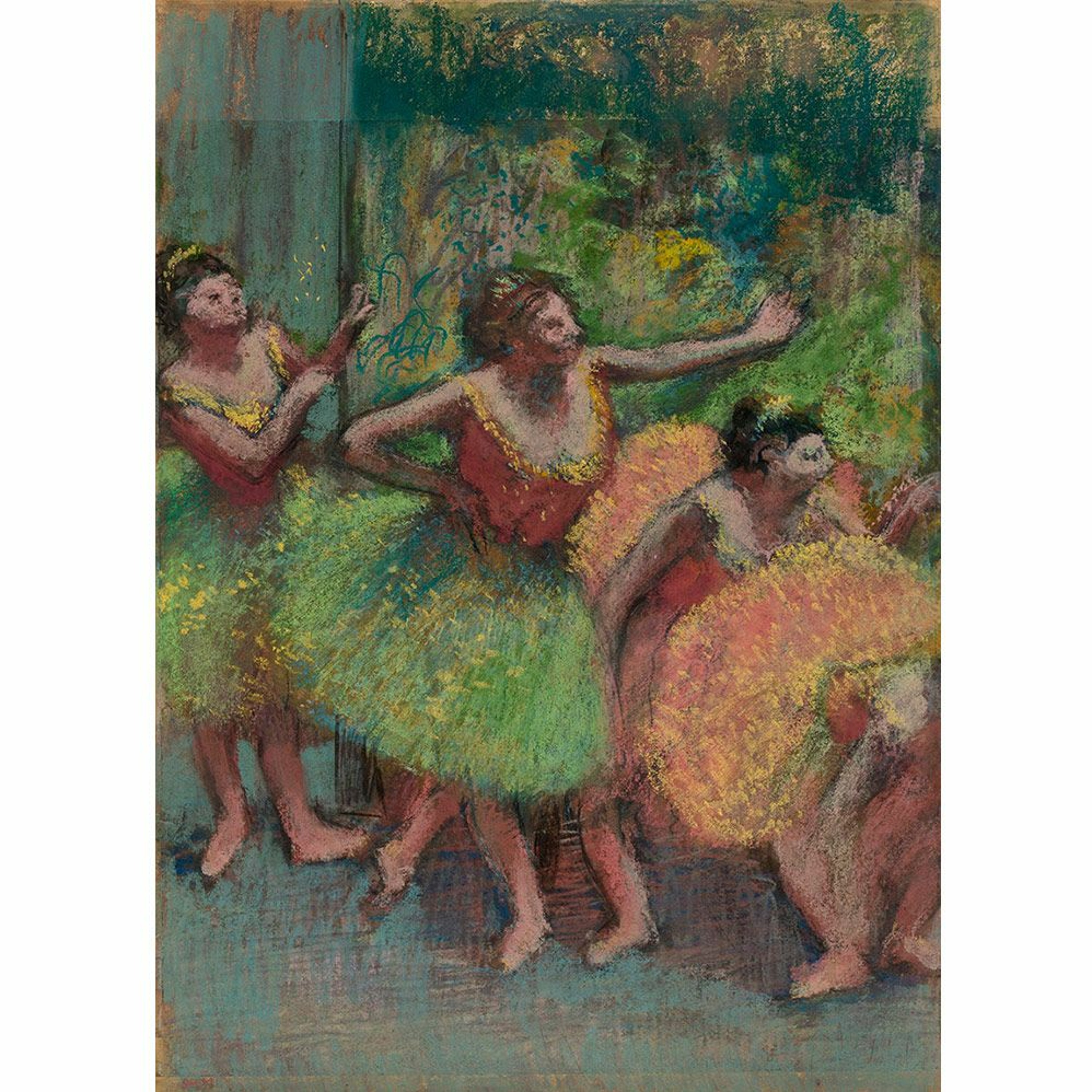 Edgar Degas, "Dancers in Green and Yellow" ("Danseuses vertes et jaunes"), ca. 1903. Pastel and charcoal on three pieces of tracing paper, mounted to paperboard, 38 7/8 x 28 1/8 inches (98.8 x 71.5 cm). Solomon R. Guggenheim Museum, New York, Thannhauser Collection, Gift, Justin K. Thannhauser 78.2514.12