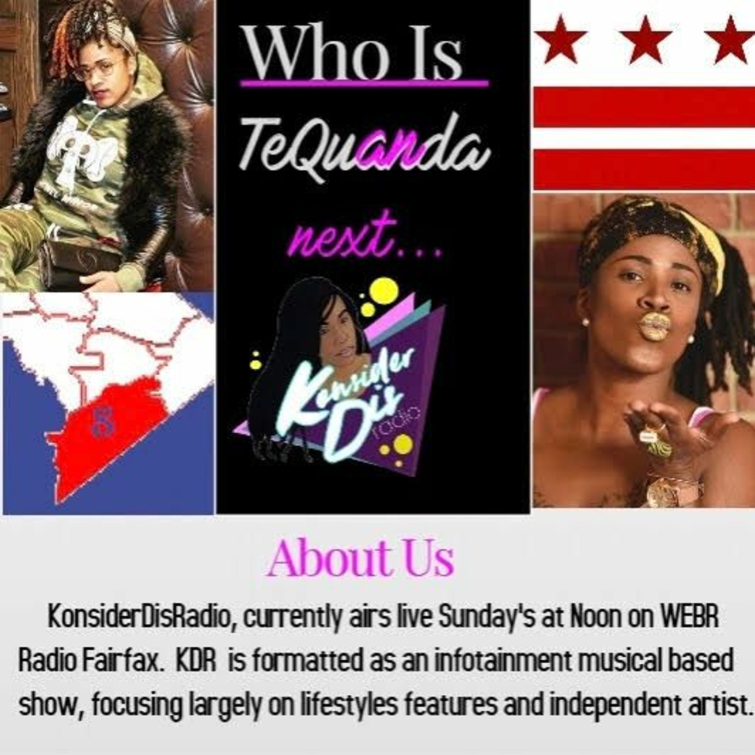 KonsiderDis Radio, currently airs live Sunday's at NOON on WEBR Radio Fairfax. KDR is formatted as an infotainment musical based show, focusing largely on lifestyles feature and independent music. Each episode begins with "Hot Topics" an opening segment- with commentary taken from listeners throughout the program. The show incorporates a heavier emphasis on stories about lifestyles topics that are not covered on traditional radio shows.