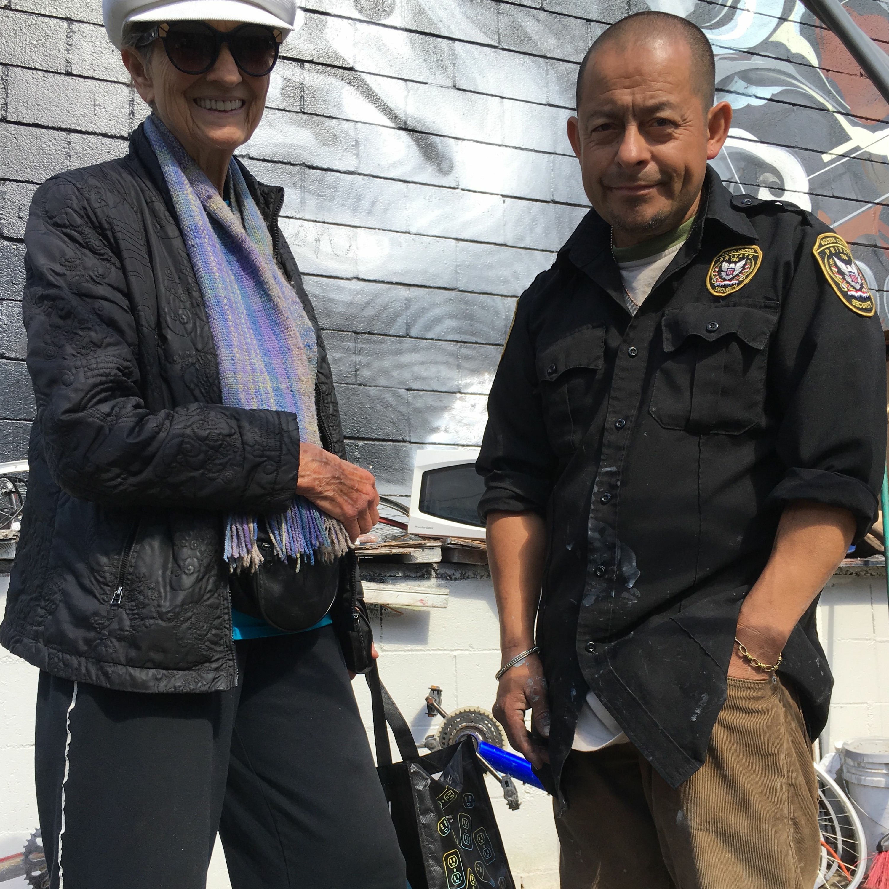 Lois Arkin, LA Ecovillage co-founder and current board member, helps Clifford, unhoused bike artisan, donate some of the bike parts he must get rid of as part of his agreement to vacate the premises he and his encampment have occupied for months.