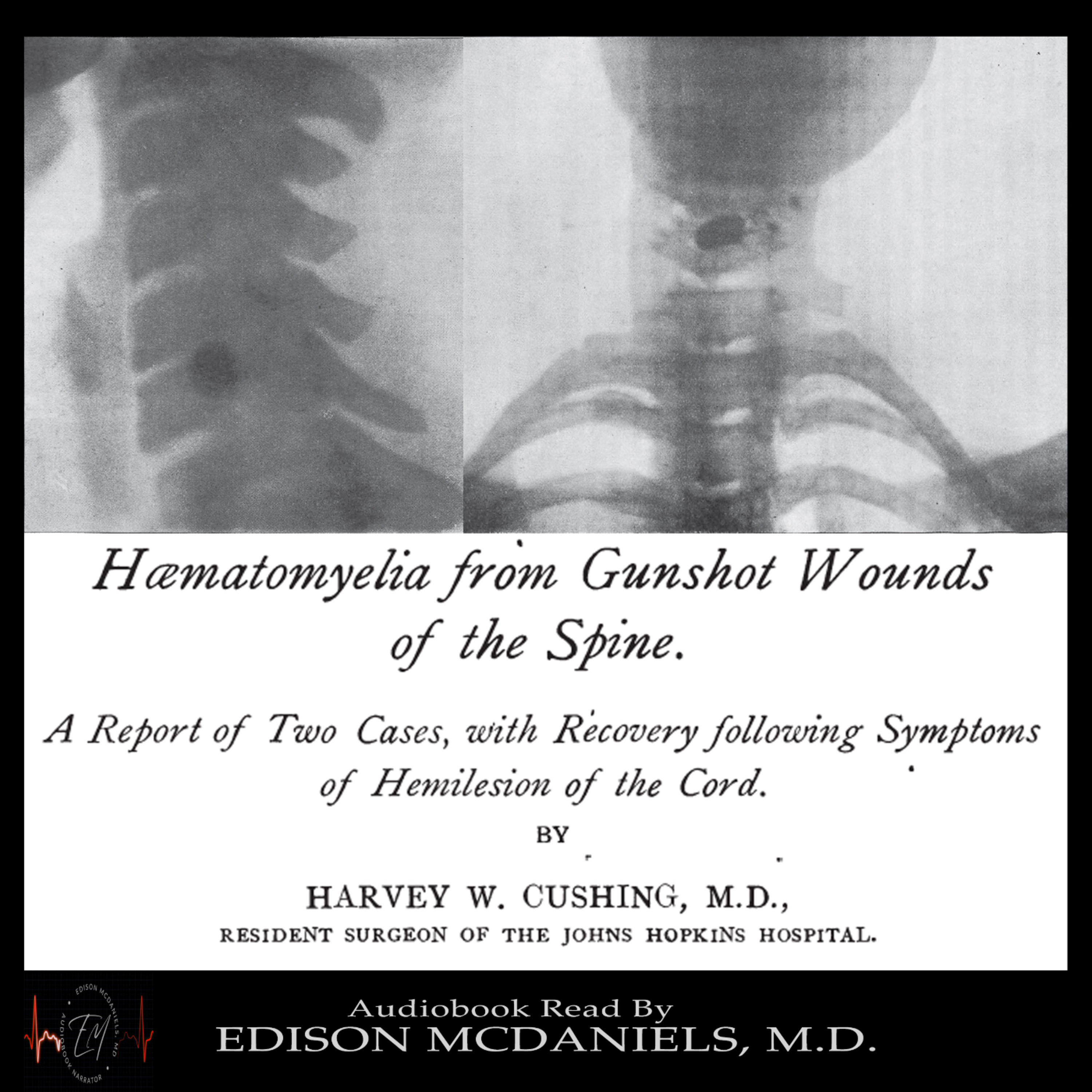 On January 1st, 1896, Wilhelm Roentgen presented the first ever x-ray, an image of his wife Anna's left hand. Later that year, a young doctor by the name of Harvey Cushing—who would go on to become one of the most prolific surgeons in history and the father of modern neurosurgery, produced the image on the cover of this audiobook, the first ever clinical x-ray (they called them roentgenograms back then) of a gunshot wound to the neck and spine.