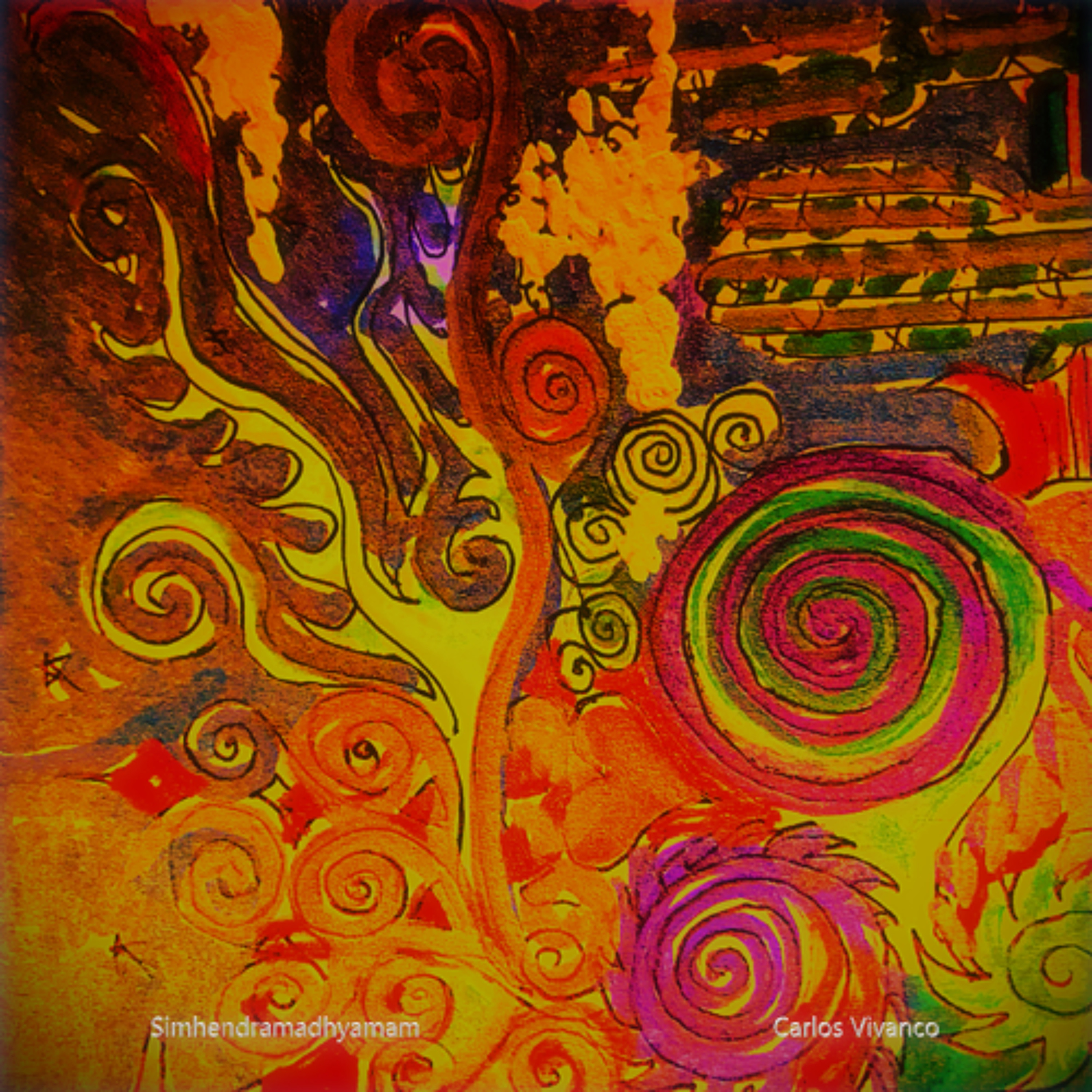 For this composition I used the scale Simhendramadhyamam, being the number 57 of the 72 Carnatic scales. This scale has an equivalent in western music where it appears as one of the forms of the Hungarian minor mode. It also has a correspondance in Niaventi, one of the modes of greek folk music.