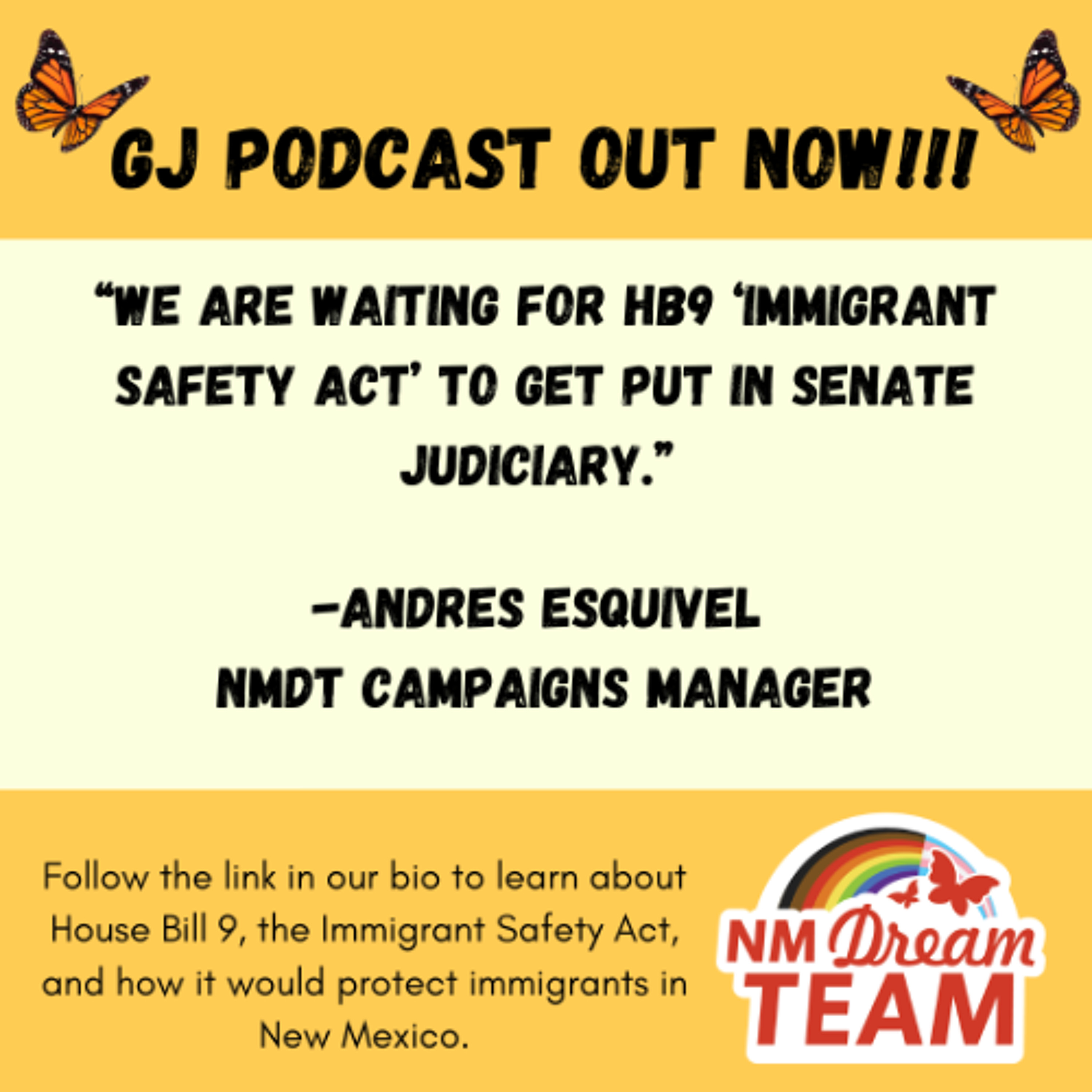 The Campaigns Manager at the New Mexico Dream Team provides an update on HB9, the Immigrant Safety Act, as it awaits placement on the Senate Judiciary Committee agenda—just one day before the NM legislative session concludes.