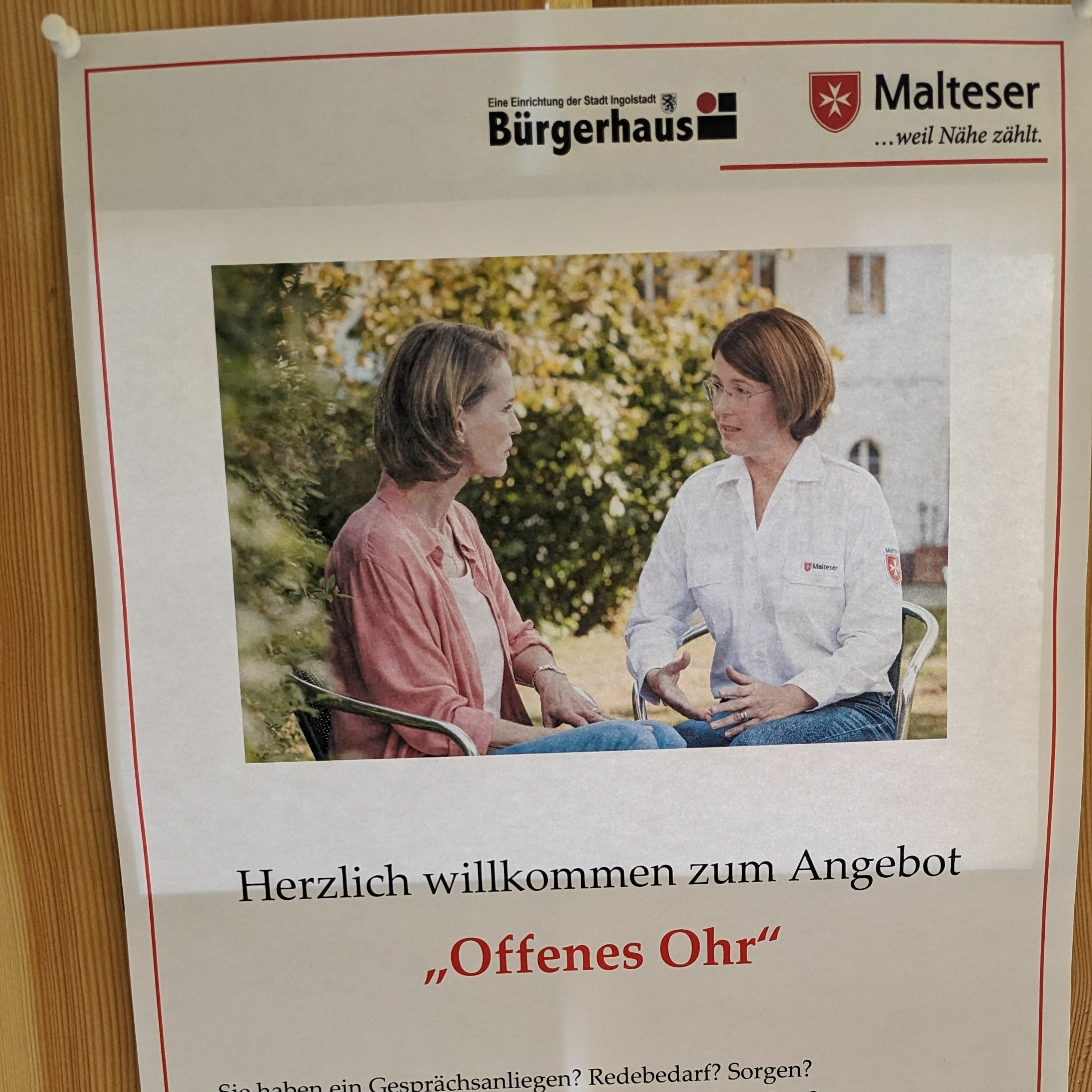 Probleme, Ängste oder Sorgen – in manchen Lebenssituationen tut es gut, wenn man darüber reden kann. Dieses Anliegen greift das Bürgerhaus Ingolstadt nun auf und stellt ein neues Gesprächsangebot vor: Das „Offene Ohr“ ist in Kooperation mit dem Malteser Hilfsdienst e.V. entstanden. Ausgebildete ehrenamtliche Seelsorgebegleiter stehen immer dienstags von 14 bis 17 Uhr für ein vertrauliches Gespräch im Bürgerhaus Neuburger Kasten zur Verfügung. Bernhard Löhlein hat dort vorbeigesehen.