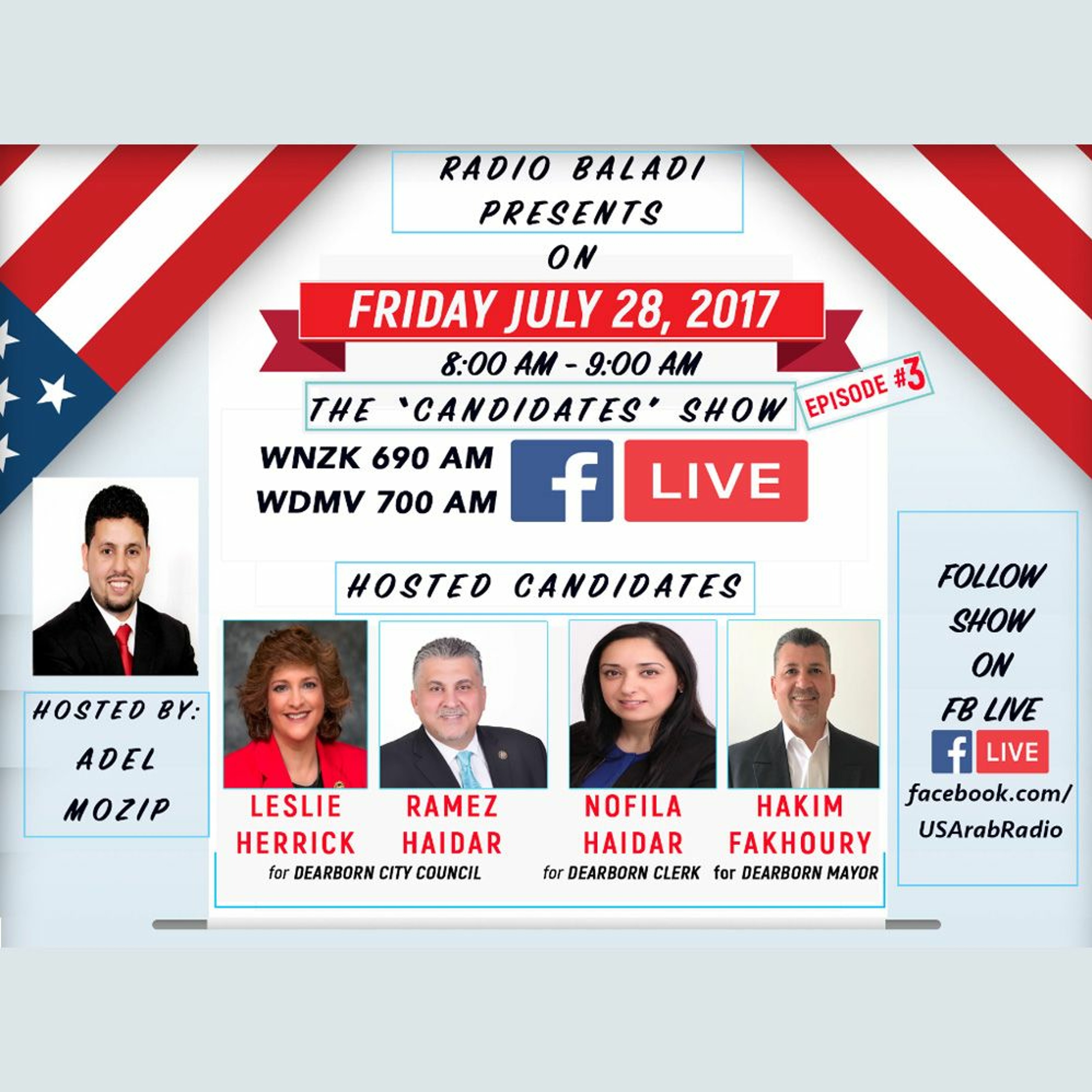 Adel hosted city council candidates: Leslie Herrick and Ramez Haidar. He also hosts candidate Nofila Haidar for City Clerk as well as Candidate Hakim Fakhoury who is vying to be Dearborn's next mayor.
