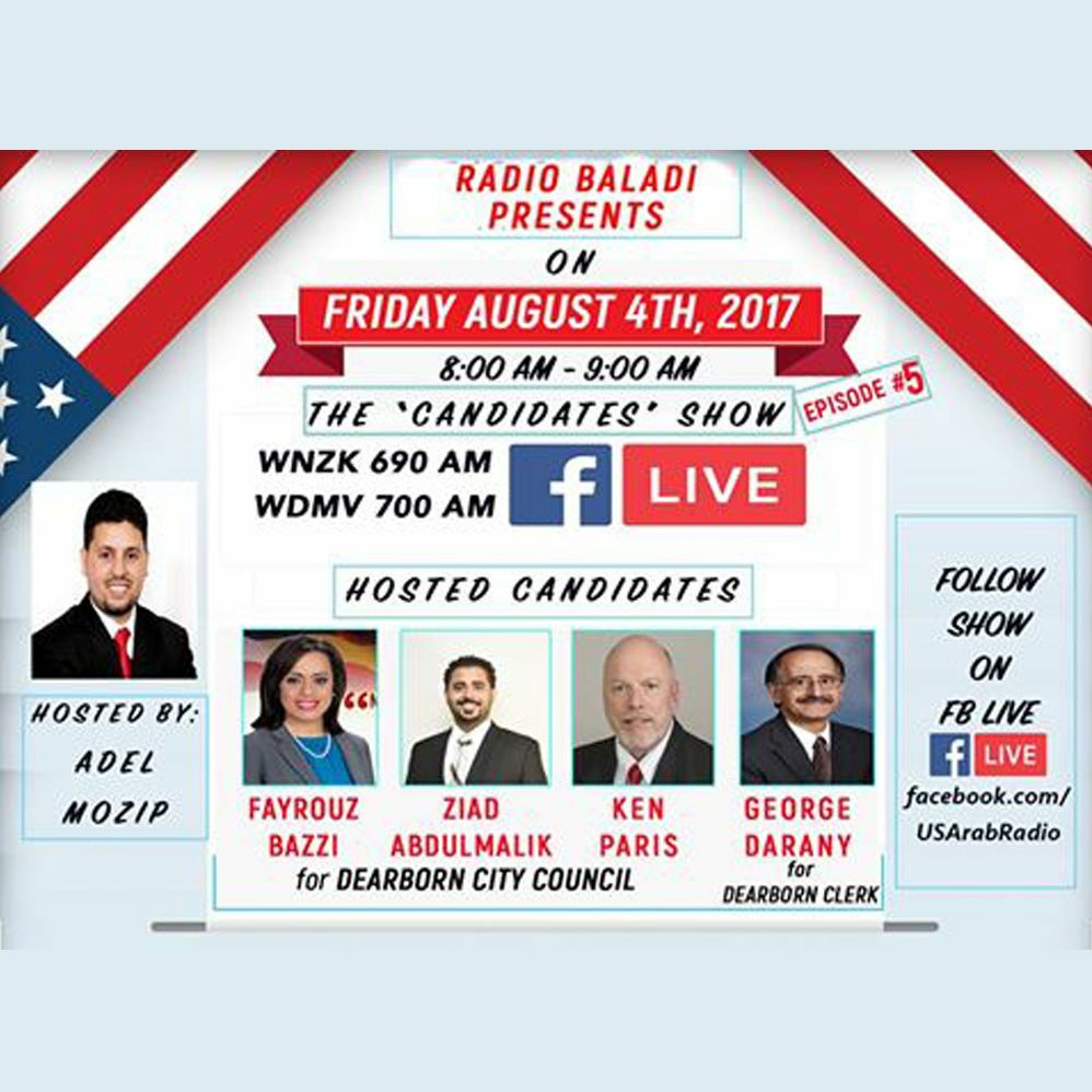 Adel Mozip, host of the "Youth & Education" show on Radio Baladi hosts 4 candidates each Friday from 14 July till August 4th in a special series called "The Candidates Show" to discuss their platform, agendas, and ideas for the City of Dearborn. In this episode, Adel hosted city council candidates: Fayrouz Bazzi and Ziad Abdulmalik, and Ken Paris. He also hosted Candidate George Darany who is running for Dearborn City Clerk.