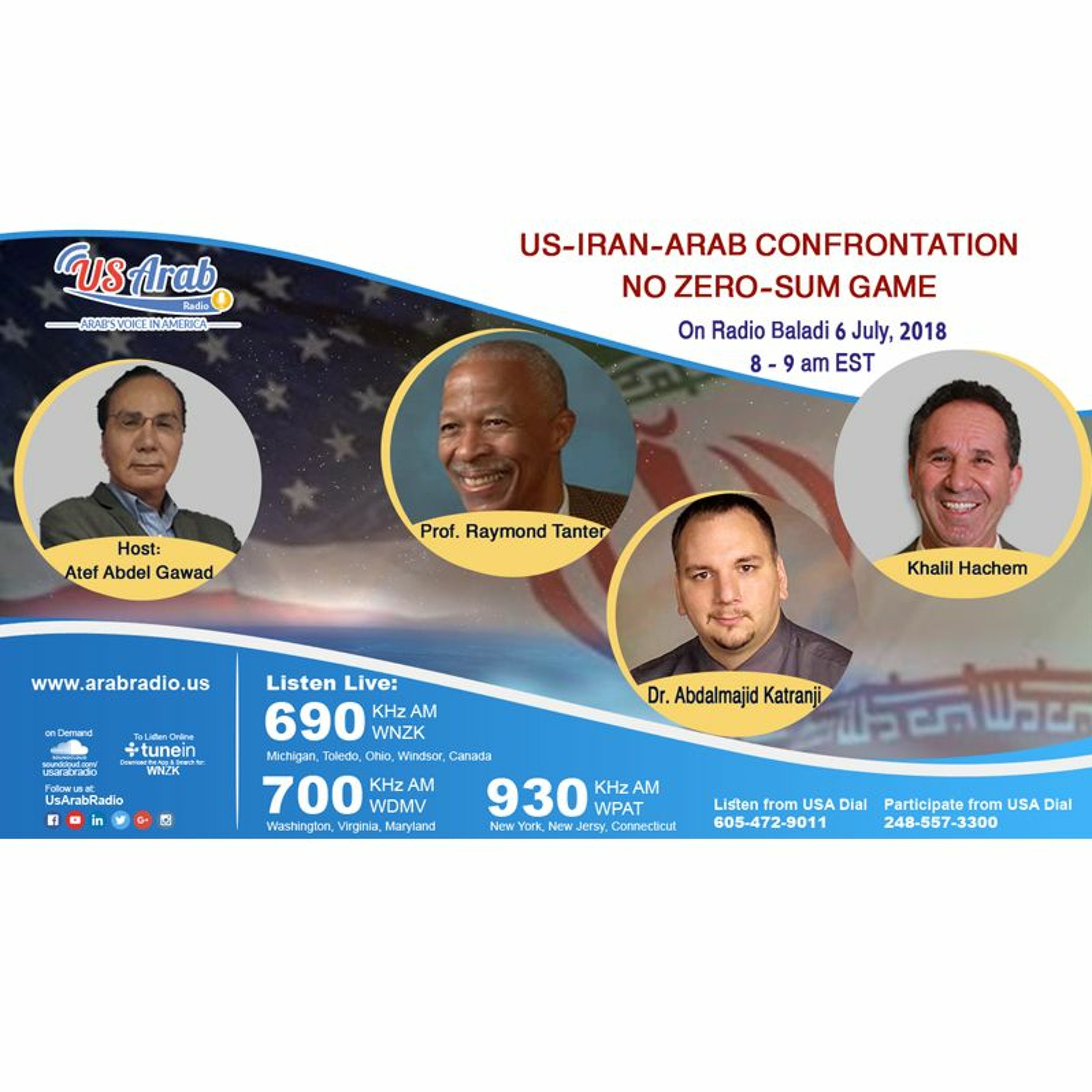 The prominent host Dr. Atef Abdel Gawad discussed US-IRAN-ARAB CONFRONTATION:NO ZERO-SUM GAME with Three distinguished guests: Professor Raymond Tanter, president of the American Committee on Human Rights and expert on US-Iran relations, Journalist Khalil Hachem, editor, and publisher of Yamichigan.com, and Dr. Abdalmajid Katranji, a surgeon and political analyst.