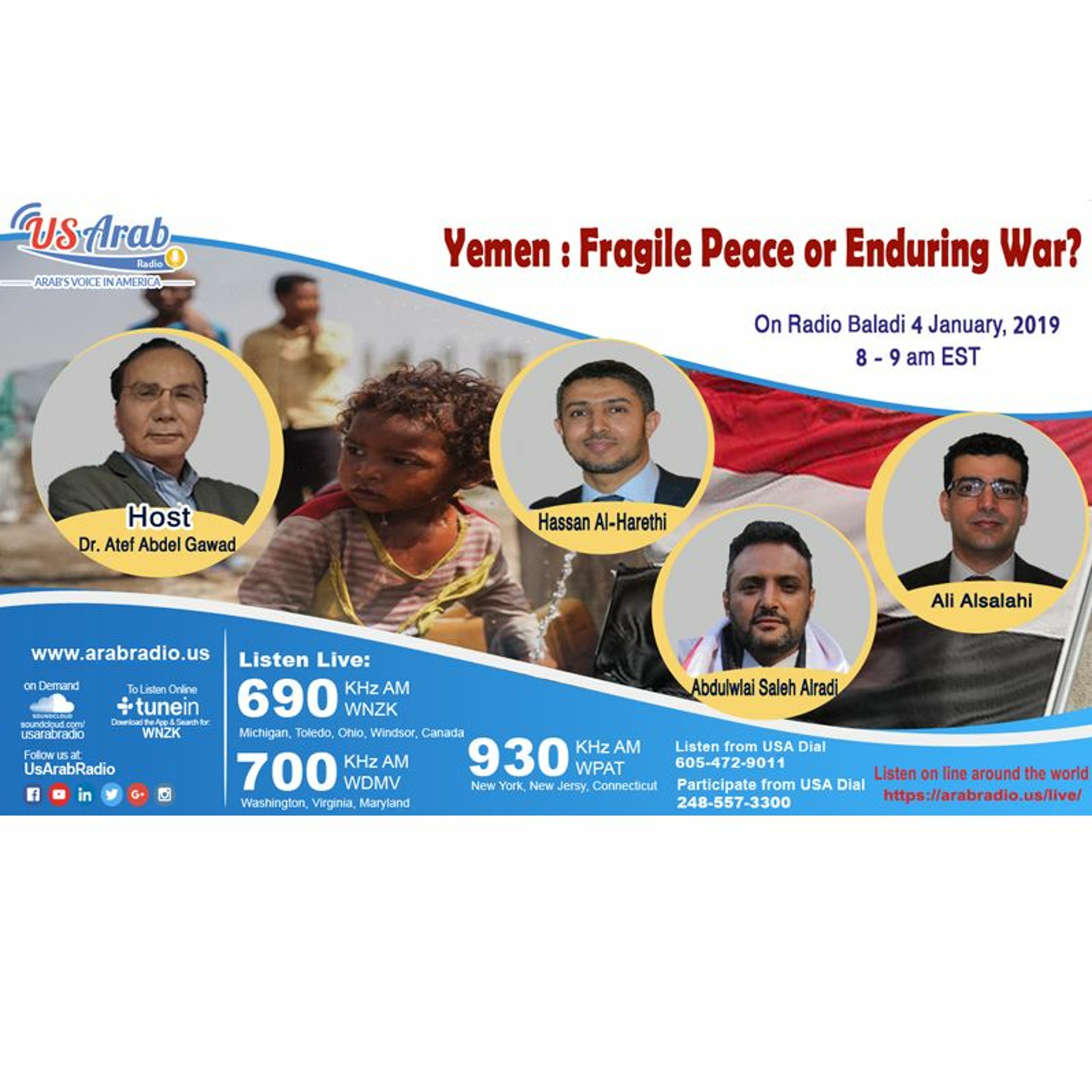 Journalist Dr. Atef Abdel Gawad discussed these topics with Mr. Ali Alsalahi is an Arabic interpreter and political analyst. He is a former Yemeni General Consul in Washington D.C., who worked with the Yemen Foreign Service for 10 years. Currently, Mr. Hassan Al-Harethi is an activist in the Yemeni community in the D.C. area. He holds a bachelor degree in computer science and works as an IT consultant/Software Architect with the College Board and Mr. Abdulwlai Saleh Alradi holds a bachelor in political science and history and a master degree in public policy from the University of Michigan Dearborn. He is the head of the Dar Alsalam organization (the home of peace) in the United States and its representative in the United Nations, and the Yemen ministry immigrants affairs senior advisor (Sanaa).