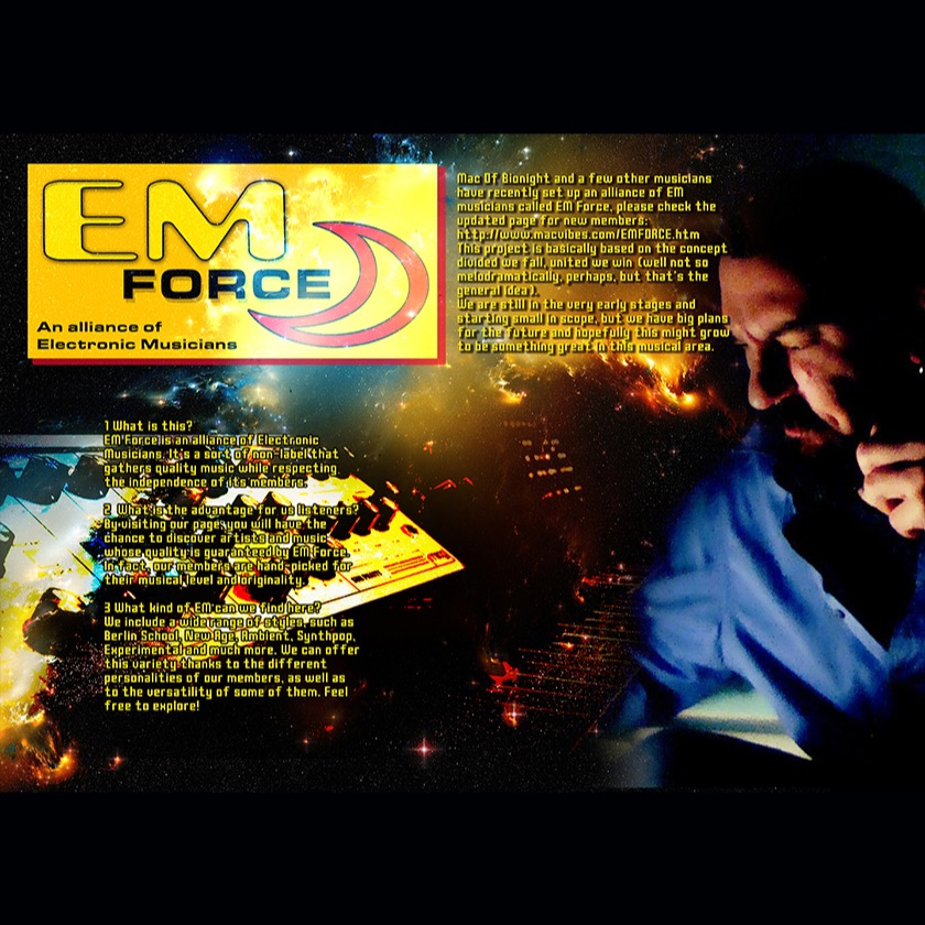 Mac Of BIOnighT and a few other musicians have recently set up an alliance of EM musicians called EM Force, please check the updated page for new members: http://www.macvibes.com/EMFORCE.htm