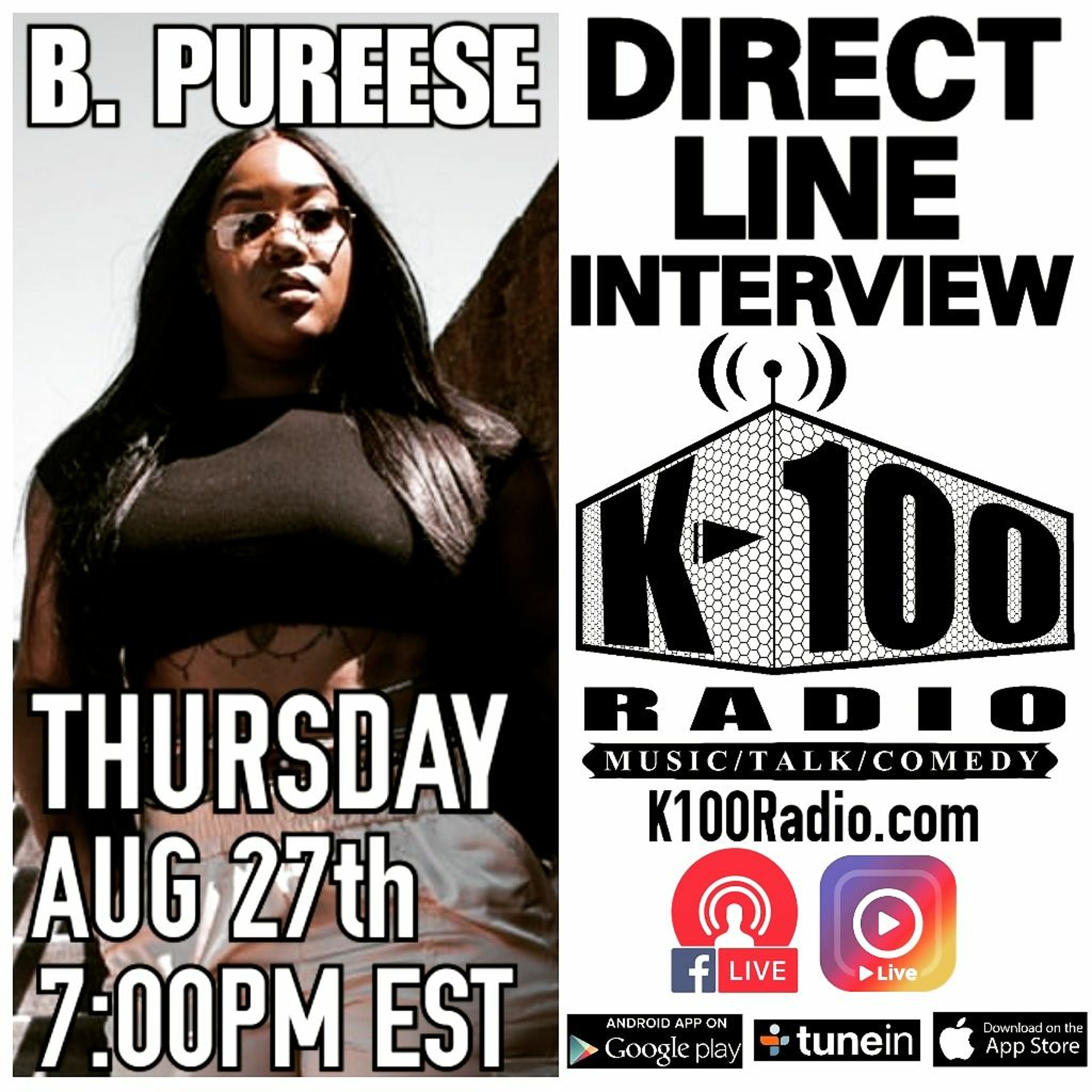 Check out the Direct Line Interview with B. Pureese on K-100 Radio. Visit our website K100Radio.com to book an interview with us.