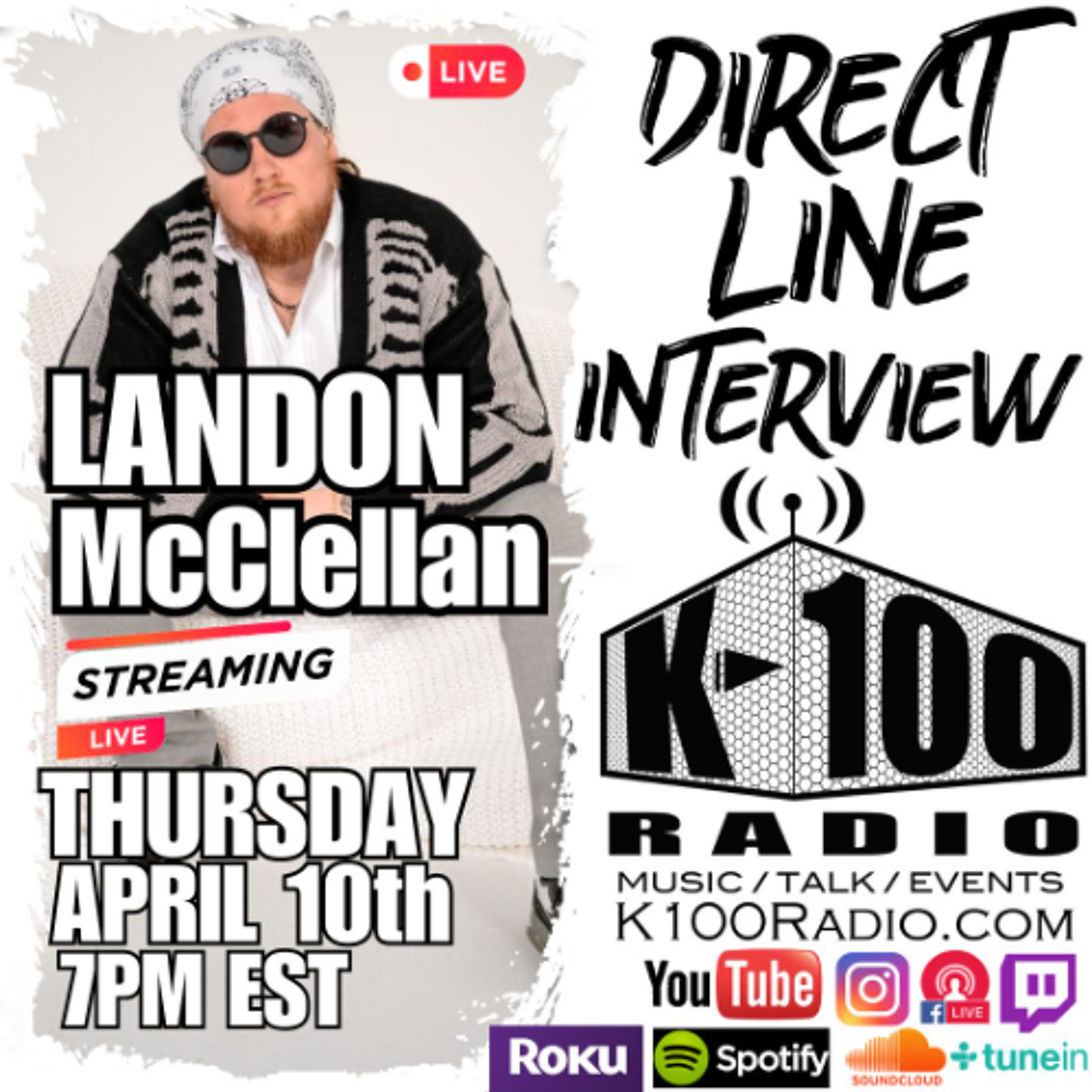 Check out the live Direct Line Interview on K-100 Radio with artist Landon McClellen. Listen in as we talk about his new music, his background and more.