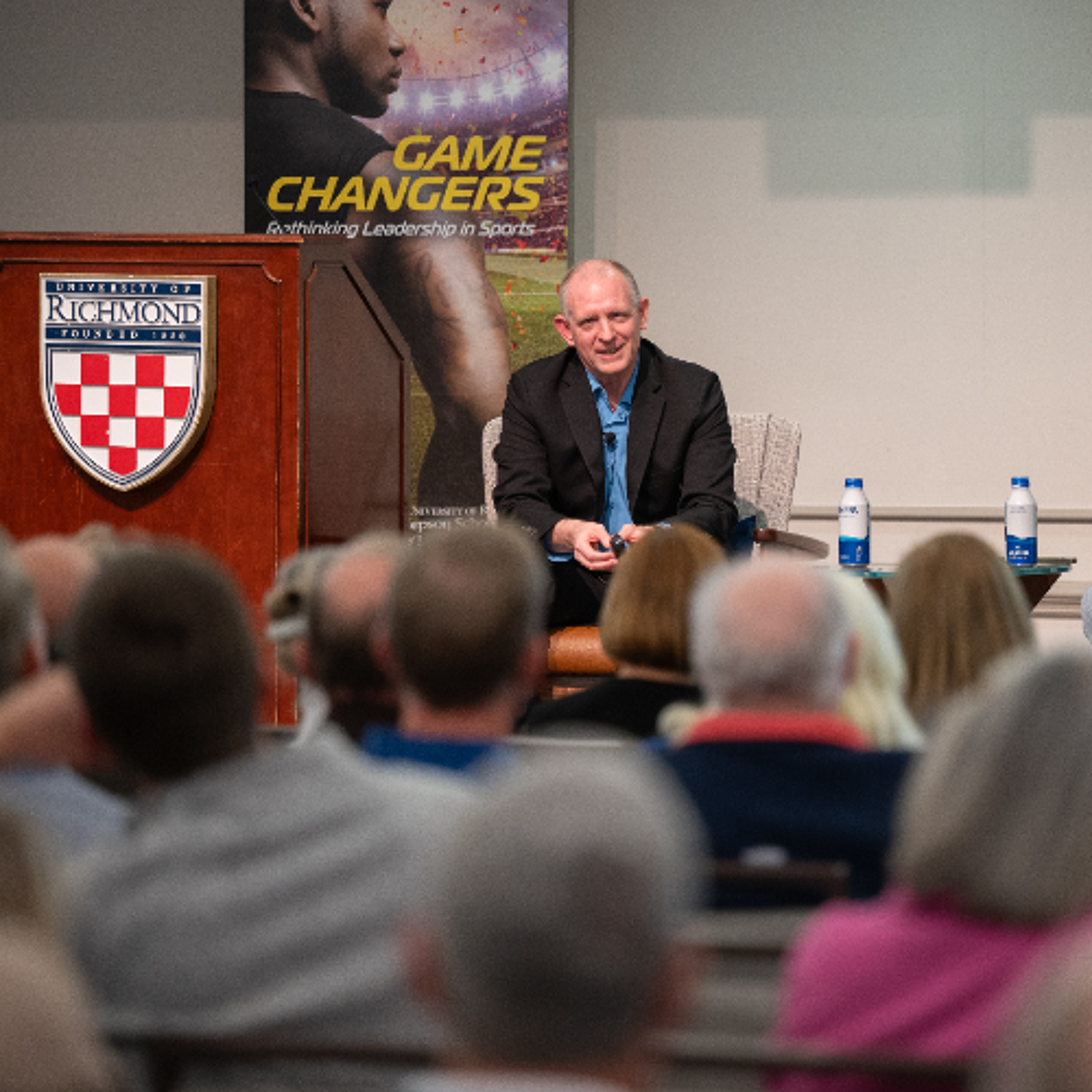 Jepson student Michael Walz, ’26, sits down with Jepson Leadership Forum speaker Dean Oliver prior to his Jepson Leadership Forum presentation "The Push for Data-Driven Decisions in Sports."