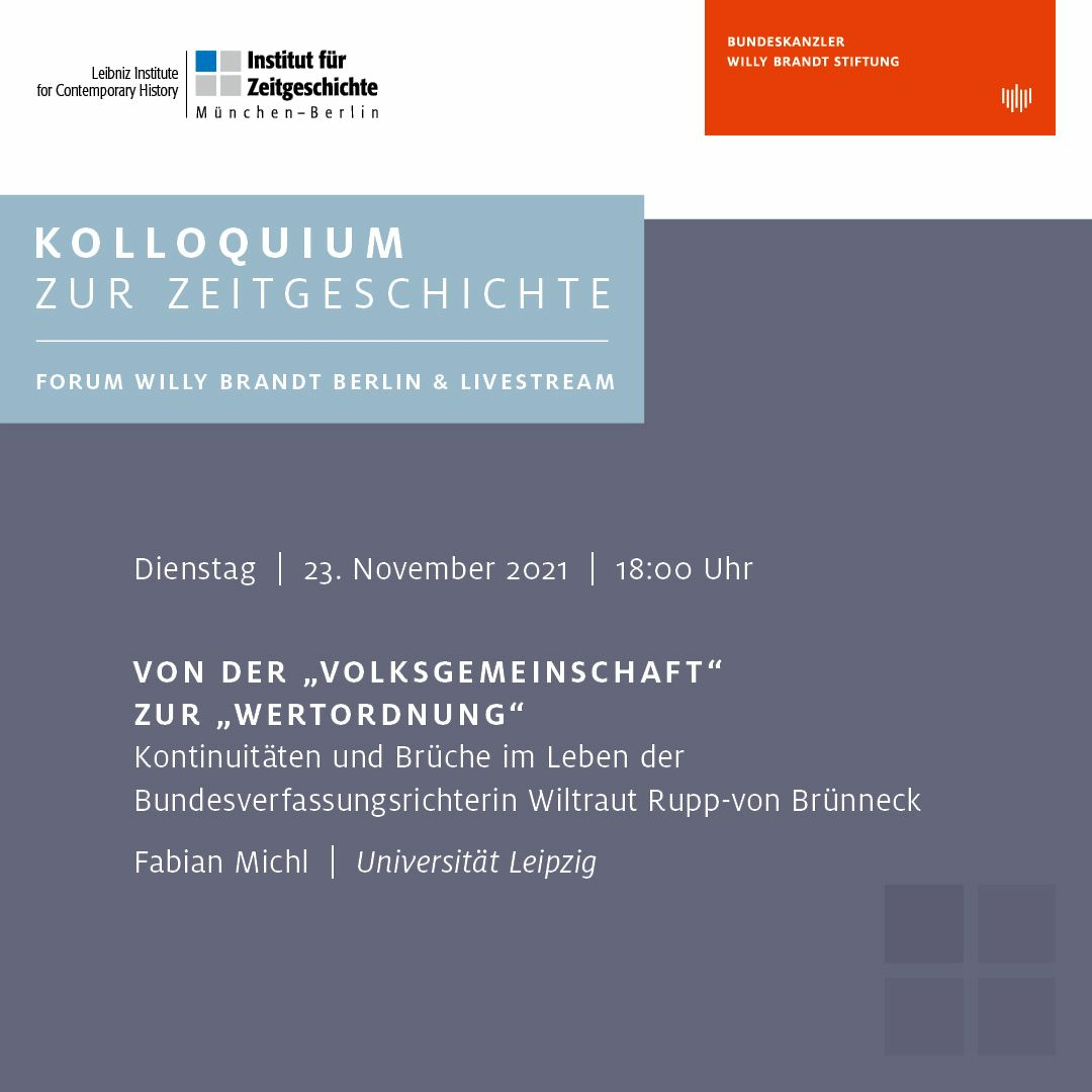 Von der „Volksgemeinschaft“ zur „Wertordnung“. Der Vortrag von Fabian Michl (Universität Leipzig) widmet sich den inhaltlichen Kontinuitäten und Brüchen in dieser äußerlich (fast) bruchlosen Laufbahn einer deutschen Ausnahmejuristin.