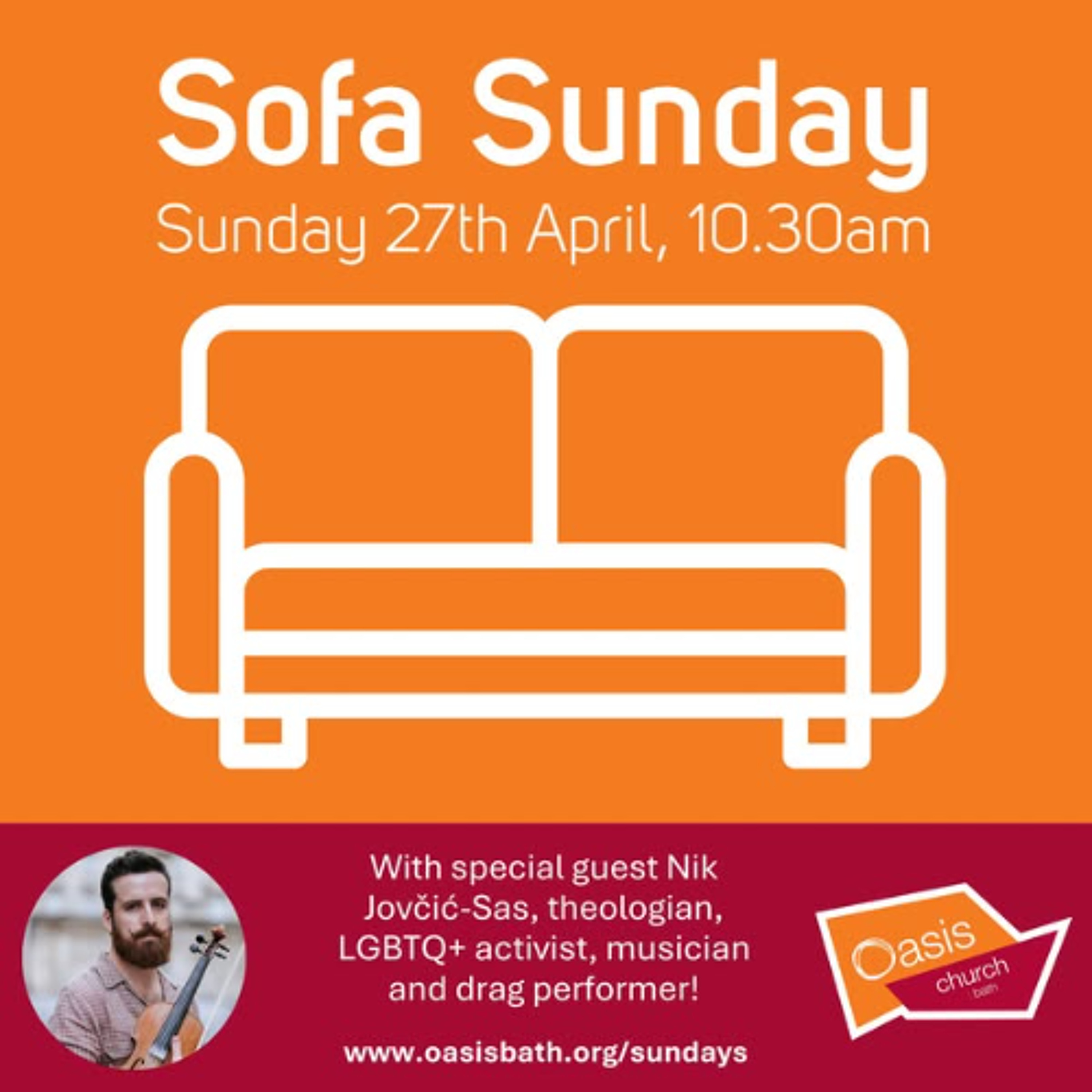 We were pleased to welcome our special guest Nik Jovčić-Sasto to the sofa at Oasis Church Bath. Nik is an Eastern Orthodox Christian, theologian, LGBTQ+ activist, musician, and drag performer. They joined us on the sofa for a conversation about their life and experiences, including a range of topics from music and activism, to mysticism and Midsomer Norton!