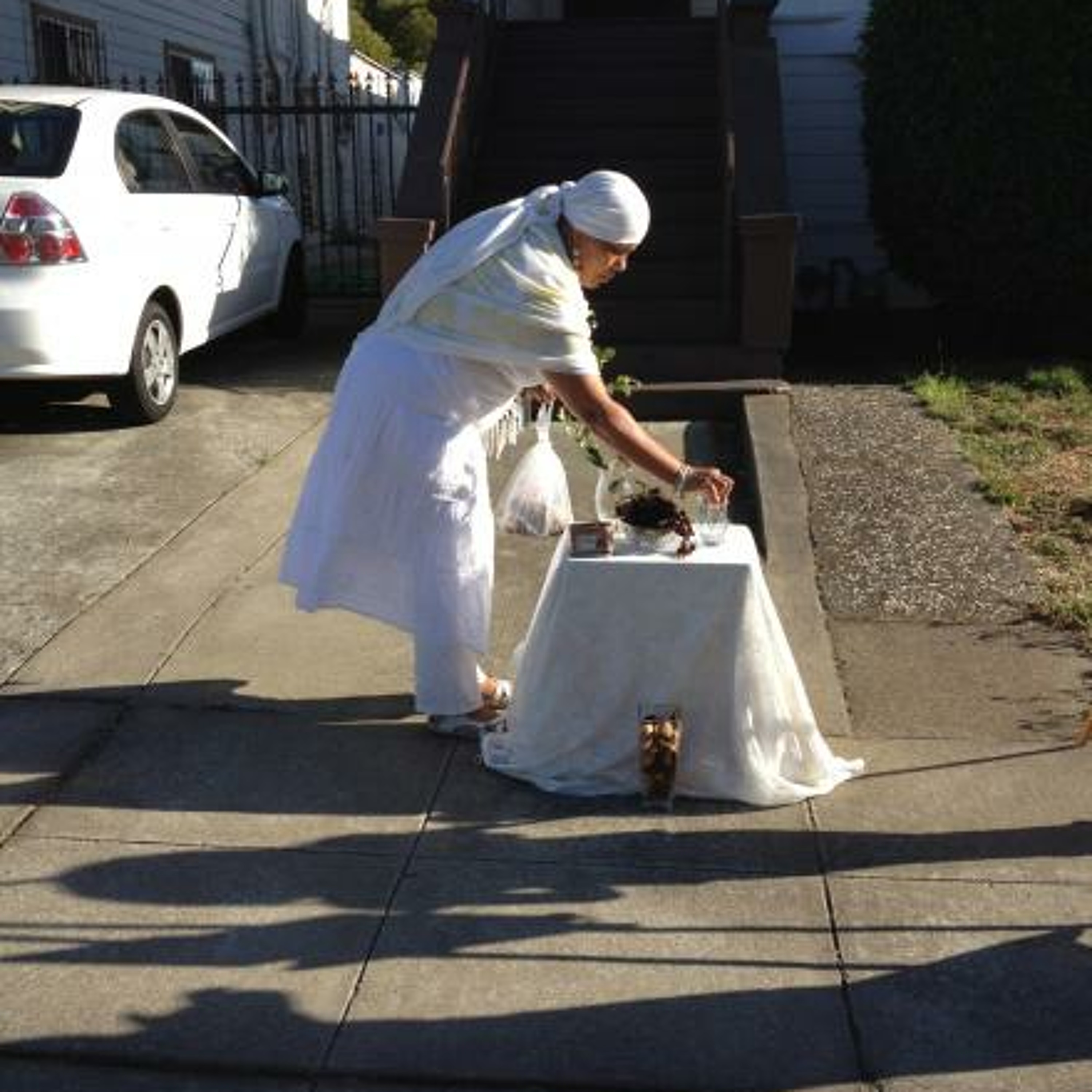 On a residential block in North Oakland, performer Ayanna Davis—known in her community as Mama Ayanna --is preparing for a performance. She lights incense, places candles and pictures on the ground, and sets up a small altar on a side table.
