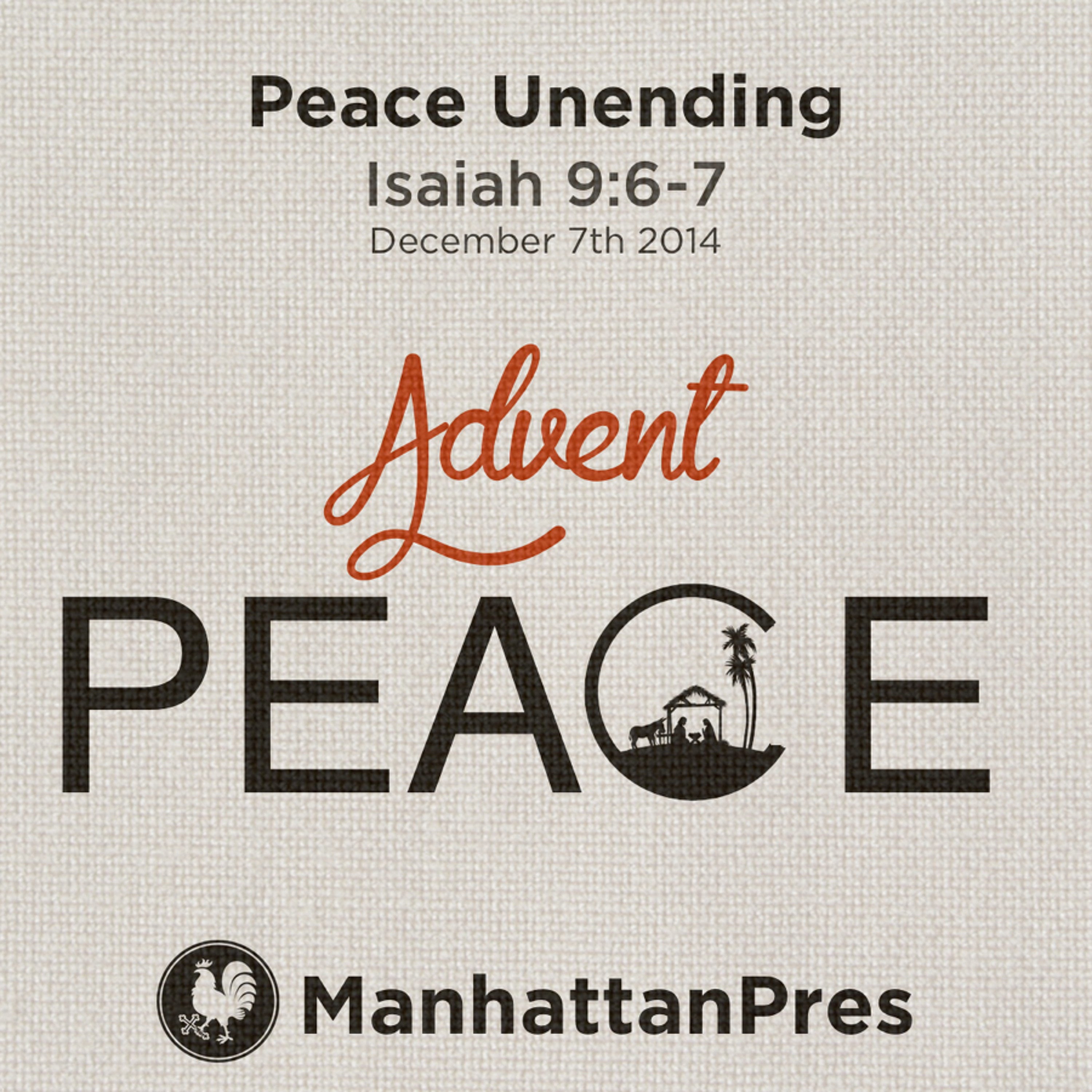 Sermon on Isaiah 9:6-7 titled Peace Unending for the second week of Advent. It was preached on December 7th 2014 at Manhattan Presbyterian Church (PCA) in Manhattan, Kansas. You can learn more at ManhattanPres.com